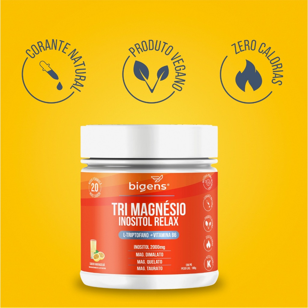 Tri Magnésio Inositol Relax Bigens é um suplemento formulado para uma excelente absorção no organismo. Tem em sua composição L-Triptofano, Inositol e Vitamina B6 além das 3 formas especiais de magnésio, sendo estes, Magnésio Dimalato que vem da associação a duas moléculas de ácido málico, Magnésio Quelato ou Bisglicinato vem da associação a duas moléculas de aminoácidos glicina e o Magnésio Taurato que vem da associação ao aminoácido de taurina. Essas associações tornam o mineral biodisponível e atuam diretamente no aumento da velocidade de absorção. Magnésio: É o quarto mineral mais abundante no nosso corpo, atrás apenas do cálcio, do sódio e do potássio, portanto, possui um papel importantíssimo no nosso organismo. O magnésio auxilia no funcionamento neuromuscular e muscular, no metabolismo de proteínas, carboidratos e gorduras, no metabolismo energético, no equilíbrio dos eletrólitos, no processo de divisão celular e também na formação de ossos e dentes. Magnésio dimalato: É composto por duas moléculas de Ácido Málico para cada molécula de Magnésio, tornando-o biodisponível e atuando diretamente no aumento da velocidade de absorção. Magnésio Taurato: é uma molécula composta por magnésio e aminoácido de taurina. Esse sinergismo permite melhorar a capacidade deste mineral de entrar diretamente nas células. Esta é uma das formas mais biodisponíveis de magnésio no mercado. Magnésio Glicina ou Bisglicinato: o Magnésio Glicina é formado pela ligação do Magnésio a dois aminoácidos glicina. Essa forma de magnésio favorece sua absorção pelo organismo. É uma opção segura para corrigir a deficiência de magnésio em longo prazo e tem menor capacidade de interferir no funcionamento do intestino. Inositol: também conhecido como vitamina B8, o inositol, na verdade, é considerado uma pseudovitamina, sendo naturalmente produzido pelo nosso organismo a partir da glicose. Ele também pode ser obtido através da alimentação ou de suplementação. O Inositol, como fosfatidilinositol, tem a sua função primária na composição e integridade da estrutura da membrana celular. É base de inúmeros sinalizadores celulares e mensageiros secundários, estando envolvido em vários processos biológicos O mio-inositol é uma isoforma do grupo do inositol, atuando a nível intracelular facilitando a entrada da glicose na célula por um processo de sensibilização dos receptores de insulina. A vitamina B6 ou piridoxina, é um micronutriente que desempenha diversas funções no organismo, como por exemplo, auxiliar na síntese de cisteína, no metabolismo de proteínas e do glicogênio, no metabolismo de carboidratos e gorduras, no funcionamento do sistema imune, no metabolismo de homocisteína e na formação das células vermelhas do sangue. L-Triptofano: por ser um aminoácido essencial, o triptofano não é sintetizado pelo próprio corpo nos seres humanos e outros animais, precisando, assim, ser ingerido. Em consequência de uma dieta desequilibrada e deficiente em vegetais e demais alimentos fonte, o triptofano pode não estar sendo oferecido ao organismo em quantidades diárias necessárias, sendo a suplementação nutricional um meio de garantir o consumo adequado deste que é um aminoácido essencial. INGREDIENTES: Inositol (Mio-inositol), Dimagnésio Malato, Bisglicinato de Magnésio, Taurato de Magnésio, L-Triptofano, Cloridrato de Piridoxina (Vitamina B6), Polpa de Maracujá, Acidulante Ácido Cítrico, Aromatizante, Edulcorante Glicosídeos de esteviol, Corante Natural Cúrcuma e Antiumectante Dióxido de Silício. NÃO CONTÉM GLÚTEN ALÉRGICOS: Pode Conter Castanha de Caju. SUGESTÃO DE USO: Adultos 19 anos, consumir 1 scoop ao dia, diluído em 150ml de água ou a bebida de sua preferência, ou conforme a orientação de médico ou nutricionista. Conservar este produto bem fechado, em lugar fresco, seco e ao abrigo da luz. Após aberto consumir em até 90 dias. Suplemento Alimentar dispensado de registro conforme Resolução RDC nº 240/2018.