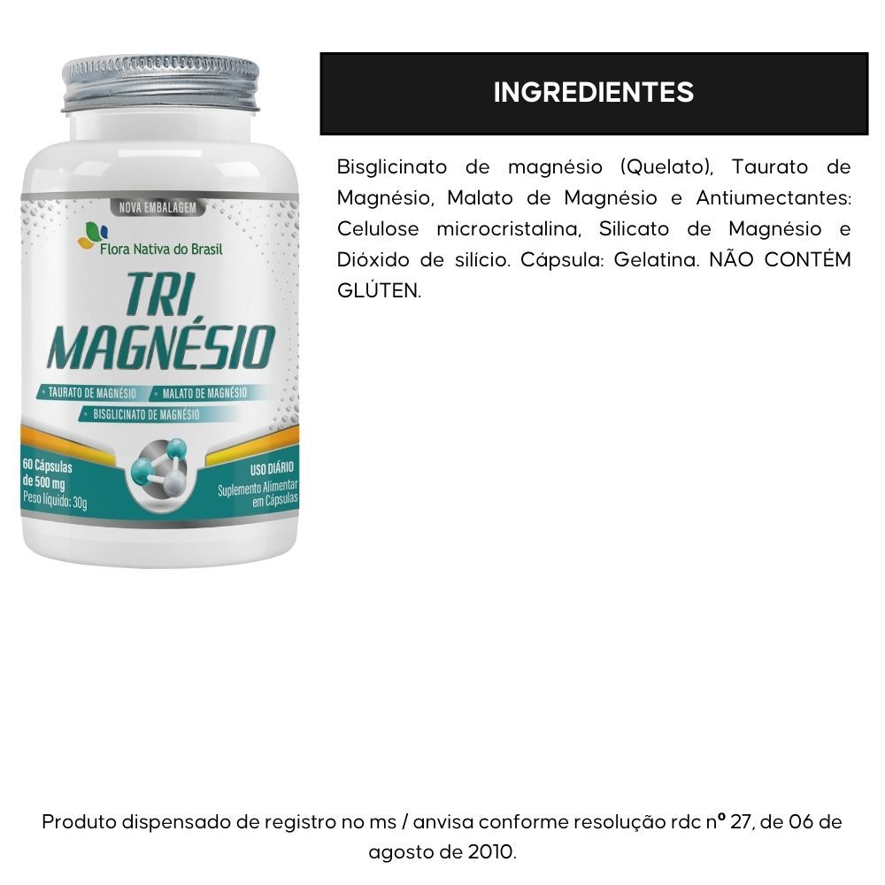 Somos Distribuidores OFICIAIS da Flora Nativa; Produto ORIGINAL com NOTA FISCAL; Enviamos seu pedido em no MÁXIMO 24h. Tri.Magnésio é um suplemento alimentar que combina Taurato de Magnésio , Malato de Magnésio e Magnésio Bisglicinato em um só produto. Uma nutrição equilibrada tem um papel muito importante na qualidade de vida. Com o ritmo acelerado de muitas pessoas, às vezes, é muito difícil prestar atenção a todos os requisitos que o corpo precisa para estar saudável e forte. Neste sentido, os suplementos cumprem a função de complementar a alimentação e ajudam a obter as vitaminas, minerais, proteínas e outros componentes indispensáveis para o correto funcionamento do organismo. COMO TOMAR Você deve ingerir 1 (uma) cápsula deste produto 2 (duas) vezes ao dia, preferencialmente junto de alguma refeição principal, ou de acordo com orientação profissional. TABELA NUTRICIONAL Porção de 1 g (2 cápsulas) Quantidade por porção % VD (*) Magnésio 240 mg 57% * % Valores diários com base em uma dieta de 2.000 Kcal ou 8400 kJ. Seus valores diários podem ser maiores ou menores dependendo de suas necessidades energéticas. **VD não estabelecido. INGREDIENTES Bisglicinato de magnésio (Quelato), Taurato de Magnésio, Malato de Magnésio e Antiumectantes: Celulose microcristalina, Silicato de Magnésio e Dióxido de silício. Cápsula: Gelatina. NÃO CONTÉM GLÚTEN.