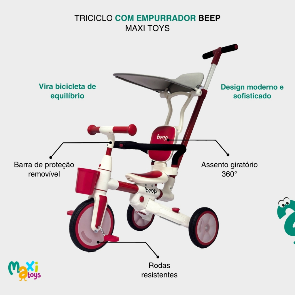 Triciclo Infantil com Empurrador 4 em 1 Bicicleta Equilíbrio Sem Pedal Beep Maxi Toys Uma escolha inteligente para quem busca qualidade, praticidade e momentos inesquecíveis com os pequenos, acompanhando seu desenvolvimento de forma divertida e segura! O Triciclo Beep da Maxi Toys foi criado para transformar os passeios em momentos de pura diversão com total segurança. Com design moderno, ele combina praticidade para os pais e muito conforto para as crianças, sendo perfeito para acompanhar cada fase do crescimento. Para oferecer tranquilidade no dia a dia, o triciclo conta com empurrador com altura ajustável e manopla anatômica, que garante firmeza e leveza ao conduzir. A capota ajustável protege contra o sol, enquanto o assento ergonômico com encosto, ajustável e giratório em 360°, proporciona ainda mais conforto e permite que a criança tenha visão do mundo ou dos pais. Já a barra de proteção removível mantém os pequenos seguros durante o uso. Além disso, o Triciclo Beep é modular e evolutivo, podendo ser transformado de acordo com a idade e habilidade da criança. Ele pode ser usado como triciclo com capota e barra de proteção, triciclo com empurrador, triciclo sem empurrador, e até mesmo como uma bicicleta de equilíbrio, garantindo diversão e aprendizado em cada etapa do desenvolvimento. E para deixar os passeios ainda mais práticos, ele possui um cestinho frontal, ideal para carregar garrafinhas, brinquedos ou pequenos objetos. Com rodas resistentes, estrutura firme e um acabamento que une durabilidade e sofisticação, o Triciclo Beep foi projetado para acompanhar as crianças em todas as etapas: desde os primeiros passeios conduzidos pelos pais até a conquista da independência ao pedalar sozinhas. Mais do que um brinquedo, o Triciclo Beep é um verdadeiro aliado da família, estimulando a coordenação motora da criança e garantindo passeios agradáveis, seguros e cheios de estilo! Principais Características: - Idade recomendada: A partir de 2 anos - Peso máximo suportado: 25kgs - Modular e evolutivo - Acompanha todas as fases até 25kg - Vira Bicicleta de Equilíbrio sem Pedal - Possui cestinho porta garrafa/objetos - Manopla anatômica - Empurrador ajustável removível - Capota ajustável removível - Assento ergonômico ajustável - Assento giratório 360º - Encosto Removível - Rodas resistentes - Estrutura leve e resistente - Design Moderno e Sofisticado - Estimula a coordenação motora e equilíbrio - Aprovado pelo Inmetro Especificações Técnicas: - Conteúdo da Embalagem: Triciclo Infantil com Empurrador 4x1 Beep Maxi Toys - Dimensões do Produto (AxLxP): 92,0 x 45,0 x 93,0cm - Composição/Material: Metal, Plástico, EVA e Tecido - Peso do Produto: 6,100 - Garantia: 90 dias (Contra Defeitos de Fabricação Pelo Fabricante) - Certificação: Inmetro IN1809523 003848/2023 - Código do Fabricante: 21930 / 21931 - EAN: 7899403219309 / 7899403219316 - Marca: Maxi Toys Imagens Meramente Ilustrativas. As cores e estampas podem variar de acordo com o lote do fabricante.
