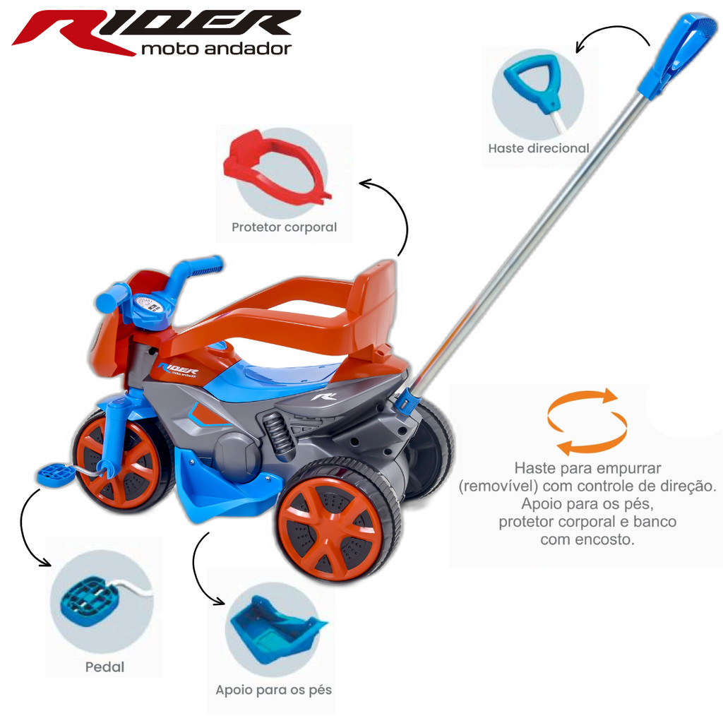 Triciclo Infantil com Haste e Pedal Moto Andador Passeio Motoca Rider Usual Brinquedos