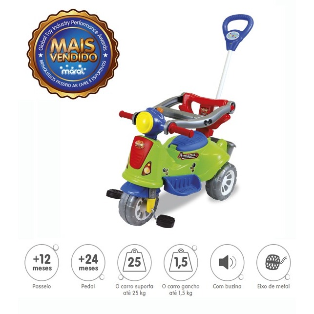 Carrinho De Passeio Ou Pedal Infantil Triciclo Avespa - Maral Um triciclo inspirado no estilo clássico, no modelo Retrô. Multifuncional, pode ser utilizado nas funções Passeio ou Pedal. Na função Passeio, o adulto empurra o carrinho através da haste-guia, ela é metálica e de fácil remoção. Tem 01 gancho superprático para pendurar uma bolsa ou sacola até 1,5 kg. Com anel de Proteção removível. Contém uma peça adicional para dar maior segurança às crianças menores. Guidão com punhos emborrachados e buzina. Dimensões do Produto (LxAxC em CM) 41x51x76 Carrinho Suporta Até: 25 kg Desenvolvimento: Coordenação entre Olhos e Mãos; Coordenação entre Olhos e Pés; Coordenação Motora Fina – Mãos e dedos; Coordenação Motora Grossa – Braços e Pernas; Atenção e Concentração; Compreensão de Causa e Efeito; Curiosidade e Descoberta. Garantia: 3 Meses.