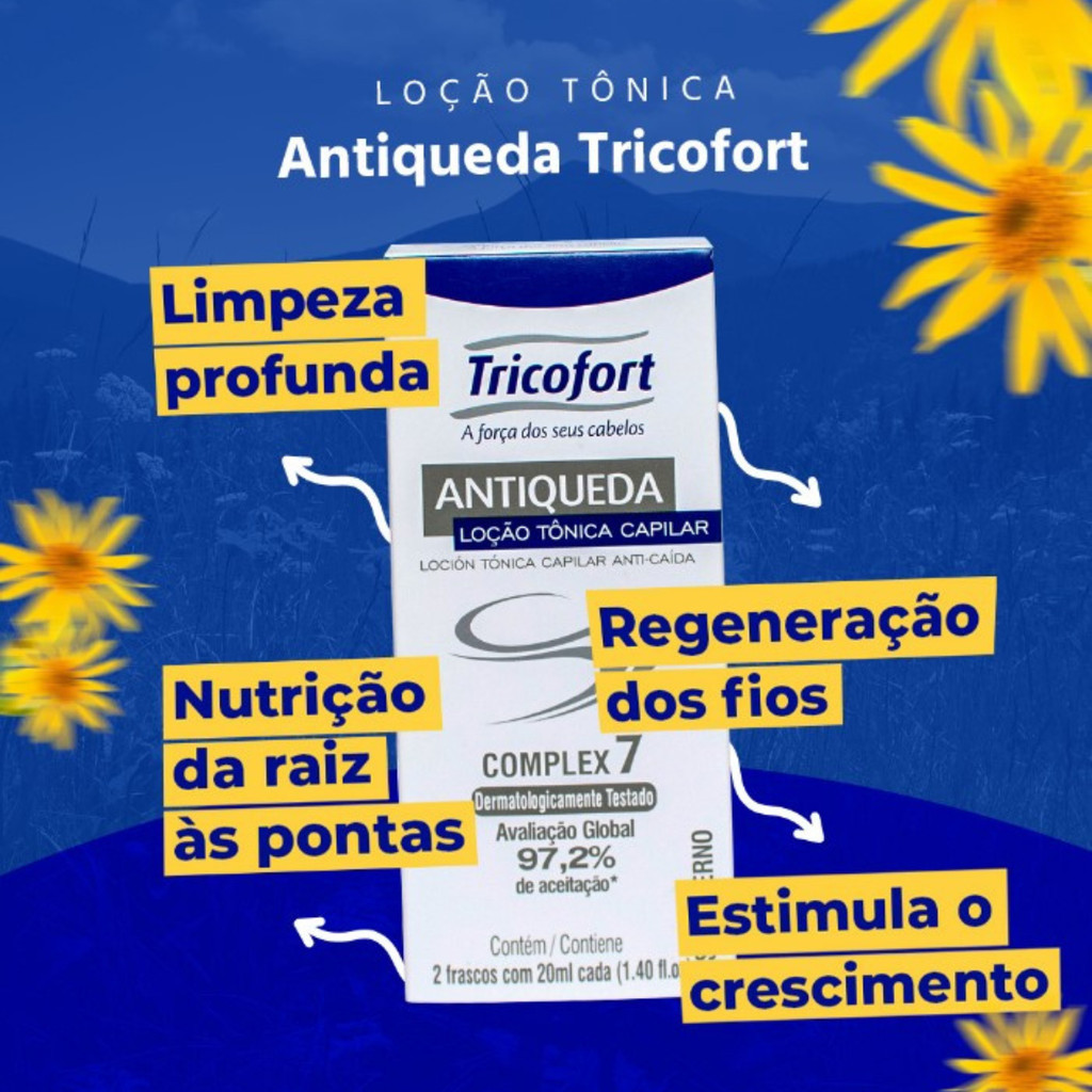 Tricofort Loção Tônica Capilar Antiqueda C/2 Ampolas 20ml Loção Antiqueda TRICOFORT A Loção Antiqueda TRICOFORT possui propriedades fortificantes, regeneradoras e reguladoras da secreção sebácea, auxiliando no controle da queda capilar. Sua fórmula exclusiva contém Disodium Cystinyl Disuccinate – um aminoácido nutritivo rico em enxofre que reestrutura a queratina e aumenta o metabolismo dos queratinócitos, melhorando a atividade capilar, estimulando o crescimento dos cabelos e diminuindo a queda. Além disso, a fórmula conta com 7 poderosos extratos vegetais (Complex 7) e modernos ativos Antiqueda. Principais Benefícios: Limpeza profunda do couro cabeludo Regeneração dos fios Regulação da oleosidade Nutrição da raiz dos cabelos Estímulo do crescimento capilar Princípios Ativos: Arnica (Arnica montana): As flores contêm óleo essencial, princípios amargos e ácidos orgânicos que estimulam o crescimento capilar e combatem a oleosidade excessiva. Germe de trigo (Triticum vulgare): Composto por ácidos graxos, vitaminas A e E e lecitina, possui ação tonificante e revitalizante. Ginseng brasileiro (Pfaffia paniculata): A raiz contém vitaminas A, B, C, D, E e F, alantoína e mucilagens com ação regeneradora celular. Pimenta Malagueta (Capsicum frutescens): O fruto possui óleos essenciais como capsaicina, vitaminas A, B, C, PP e E, proteínas, pigmentos, açúcares e ácidos orgânicos que estimulam a circulação do couro cabeludo e evitam a queda dos cabelos. Gengibre (Zinziber officinalis): A raiz contém óleo essencial, amido, proteínas, princípios amargos, ácidos orgânicos, gorduras, sais minerais e resina com ação tonificante e estimulante da circulação periférica. Quina (Cinchona succirubra): A casca possui óleo essencial como limoneno e cânfora, alcaloides, sais minerais, resinas e taninos com ação tonificante e estimulante do crescimento capilar. Urtica dióica: A parte aérea atua como vasodilatador, auxiliando na redução da queda capilar, estimulando o crescimento dos cabelos e combatendo a caspa.