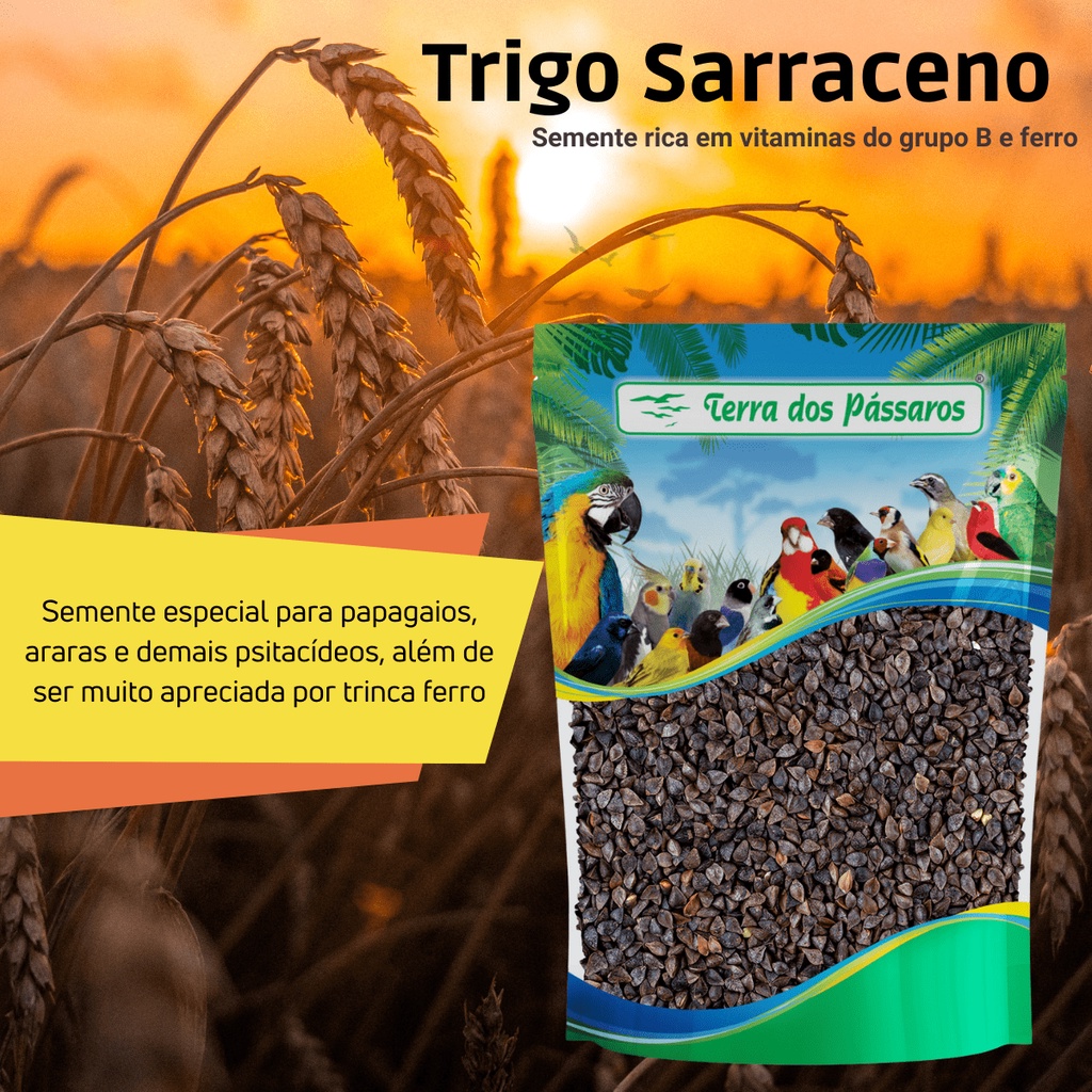 Semente especial para papagaios, araras e demais psitacídeos, além de ser muito apreciada por trinca ferro._x000d_ _x000d_ _x000d_ O trigo sarraceno é rico em vitaminas do grupo B e ferro, sendo indicado para anemias._x000d_ _x000d_ Sementes e misturas de produção própria contam com tripla limpeza: Nossas sementes são limpas por processo de ventilação e peneiramento, sistema que força o desprendimento das partículas de poeira da casca dos grãos, assim como outras impurezas típicas da colheita dos grãos. Não adicionamos nenhum tipo de produto conservante as nossas sementes. Armazene sempre em local seco, fresco e arejado ao abrigo da luz solar. Utilize sempre a embalagem original. Após o uso feche com a ajuda de arame ou cordão para evitar o ataque de insetos e carunchos. Fornecer o alimento em recipiente apropriado e limpo. Deixar sempre água fresca a disposição do pássaro._x000d_