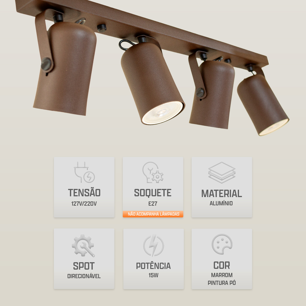 Trilho 4 Spots Direcionáveis Luminária Teto Marrom Sala