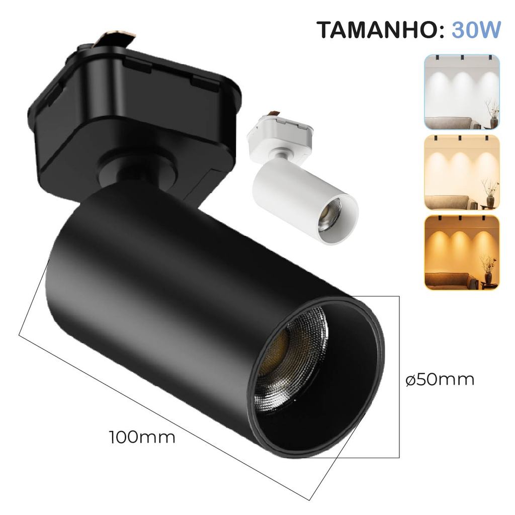 Trilho Spot LED para trilho eletrificado + Trilho + Conector Preto ou Branco 30W 360° Luz Fria, Neutra e Quente Bivolt