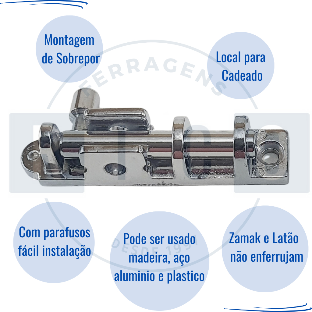 A UNIÃO MUNDIAL é uma indústria que atua no mercado de ferragens desde 1988 e produz mais de 1 milhão e meio de peças por mês. Os trincos-ferrolhos-fechos fio-redondo União Mundial associam design moderno e segurança Podem ser usados em portas, janelas e portões. Servem tanto para aberturas de correr e de abrir. E tambem tem a opção do colocação de cadeado Material: Corpo e castanha de Zamac e pino de Latão Dimensão pino aberto : 7,3 cm Dimensão pino fechado : 6 cm Largura : 1,3 cm Instalação : Sobrepor Acompanha Parafusos Acabamento: Cromado - CR/ Ouro Velho - FLO - escolher no anuncio --- Rico Mercantil Ferragens--- Seja Bem Vindo ! Como trabalhamos : - Aceitamos todas as formas de pagamento - Todos os nossos itens comercializados são novos, originais e com garantia - Os produtos aqui oferecidos estão disponíveis fisicamente em nossa loja física. - Postagem em até 24 horas úteis após a confirmação do pagamento - Para alguns produtos, temos a opção de retirada em nossa loja física em Campinas-SP , estabelecida na região central da cidade desde 1997. - Os preços praticados aqui são exclusivos para vendas online É um prazer atendê-lo !!!! ---Aguardamos o seu pedido---