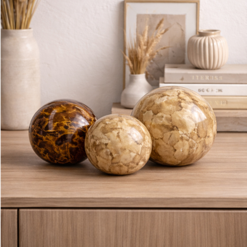 Trio Bolas Decorativas em Cerâmica - Elegância e Sofisticação para sua Decoração Apresentamos o incrível Trio Bolas Decorativas em Cerâmica, um conjunto que elevará o charme e a elegância da sua decoração. Composto por 1 bola decorativa grande com 12cm de diâmetro, 1 bola decorativa média com 10cm de diâmetro e 1 bola decorativa pequena com 9cm de diâmetro, estas peças são verdadeiras obras de arte feitas com carinho e precisão em processos manuais. Cada bola é única, pintada à mão com uma técnica marmorizada que confere sofisticação e autenticidade. Não existe uma igual a outra, tornando sua decoração verdadeiramente exclusiva. O Trio Bolas Decorativas em Cerâmica é versátil e pode ser usado de diversas maneiras. Decore racks e estantes, use como centro de mesa em ocasiões especiais como open house, casamento, dia dos namorados, aniversários e natal, ou combine com outros itens de decoração para criar composições únicas. Surpreenda alguém especial com este presente encantador e exclusivo, ou adquira-o para transformar sua casa em um ambiente cheio de charme e personalidade. A autenticidade das peças feitas à mão e a pintura marmorizada garantem que sua decoração seja única e inesquecível. Traga sofisticação e elegância para sua casa e celebre momentos especiais com o Trio Bolas Decorativas em Cerâmica. Sua decoração nunca mais será a mesma! **As bolas possuem cavidade na parte inferior e vai com proteção para não riscar os móveis.
