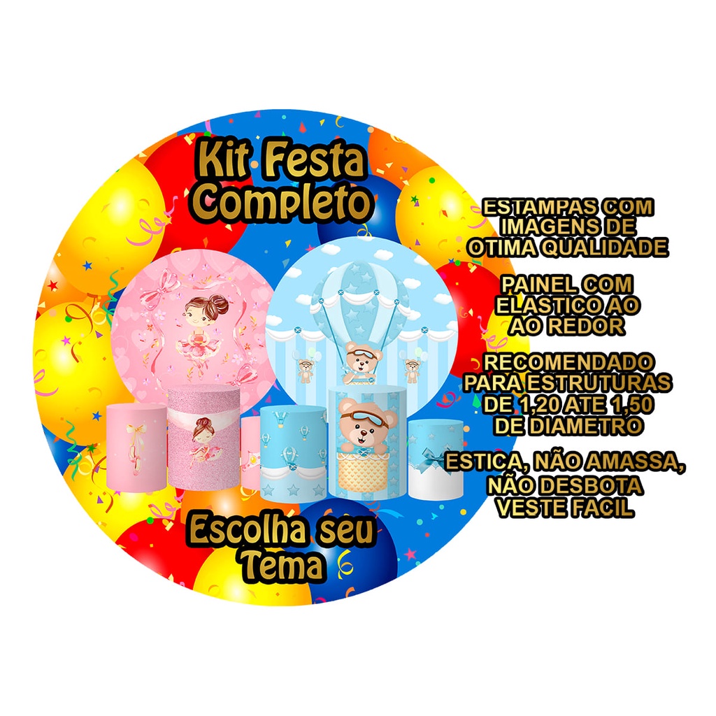 ***NÃO ACOMPANHA ESTRUTURAS/SUPORTES*** *** ATENCAO: NAO FAZEMOS AJUSTES DE MEDIDA OU ARTE NAS CAPAS DE CILINDRO DESTE ANUNCIO. VERIFIQUE AS MEDIDAS ANTES DE FINALIZAR A COMPRA *** >>>ATENCAO >> PAINEL REDONDO EM TECIDO COM ACABAMENTO EM ELASTICO >> PAINEL NAO POSSUI EMENDA!!! >>> MEDIDAS DO TRIO DE CAPA PARA CILINDRO: TAMANHO P: (A) Altura: 48cm // (D) Diametro: 39cm // (C) Circunferencia: 122cm TAMANHO M: (A) Altura: 60cm // (D) Diametro: 45cm // (C) Circunferencia: 141cm TAMANHO G: (A) Altura: 80cm // (D) Diametro: 51cm // (C) Circunferencia: 160cm Agora sua festa esta completa!!! Gracas ao Kit de Capas para Cilindro e Paineis Redondos em Tecido, voce ja conhece nossa qualidade na confeccao dos paineis de festa e tambem podera contar com a gente nas capas de cilindro em tecido sublimado da sua decoracao. DETALHES DO TRIO DE CAPA PARA CILINDRO E PAINEIS REDONDOS EM TECIDO: Tecido Malha New (Que estica e nao amassa). Tecido Leve com otimo caimento Gramatura: 140g/m de excelente qualidade. Composicao do Tecido: 95% Poliester e 5% de Elastano. Elastico cuidadosamente costurado na base dos cilindros e ao redor do painel. Acabamento em overloque evitando que o cilindro desfie. BENEFICIOS DAS CAPAS DE CILINDRO E PAINEIS REDONDOS : Sistema "Veste Facil". Agilidade na instalacao Cores vivas que nao desbotam Sua decoracao fica pronta em poucos minutos Estica e nao amassa. Pode ser lavado quantas vezes for necessario Nao reflete luz, por ser feito em tecido