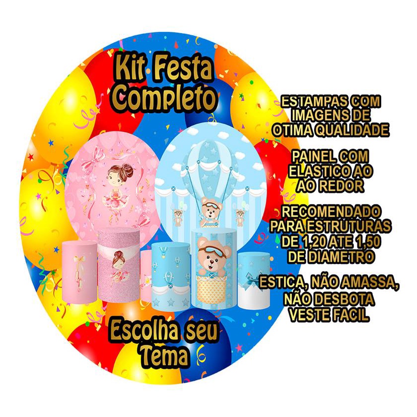 CILINDRO *** ATENCAO: NAO FAZEMOS AJUSTES DE MEDIDA OU ARTE NAS CAPAS DE CILINDRO DESTE ANUNCIO. VERIFIQUE AS MEDIDAS ANTES DE FINALIZAR A COMPRA *** >>>ATENCAO >> PAINEL REDONDO EM TECIDO COM ACABAMENTO EM ELASTICO >> PAINEL NAO POSSUI EMENDA!!! >>> MEDIDAS DO TRIO DE CAPA PARA CILINDRO: TAMANHO P: (A) Altura: 48cm // (D) Diametro: 39cm // (C) Circunferencia: 122cm TAMANHO M: (A) Altura: 60cm // (D) Diametro: 45cm // (C) Circunferencia: 141cm TAMANHO G: (A) Altura: 80cm // (D) Diametro: 51cm // (C) Circunferencia: 160cm Agora sua festa esta completa!!! Gracas ao Kit de Capas para Cilindro e Paineis Redondos em Tecido, voce ja conhece nossa qualidade na confeccao dos paineis de festa e tambem podera contar com a gente nas capas de cilindro em tecido sublimado da sua decoracao. DETALHES DO TRIO DE CAPA PARA CILINDRO E PAINEIS REDONDOS EM TECIDO: Tecido Malha New (Que estica e nao amassa). Tecido Leve com otimo caimento Gramatura: 140g/m de excelente qualidade. Composicao do Tecido: 95% Poliester e 5% de Elastano. Elastico cuidadosamente costurado na base dos cilindros e ao redor do painel. Acabamento em overloque evitando que o cilindro desfie. BENEFICIOS DAS CAPAS DE CILINDRO E PAINEIS REDONDOS : Sistema 'Veste Facil'. Agilidade na instalacao Cores vivas que nao desbotam Sua decoracao fica pronta em poucos minutos Estica e nao amassa. Pode ser lavado quantas vezes for necessario Nao reflete luz, por ser feito em tecido.