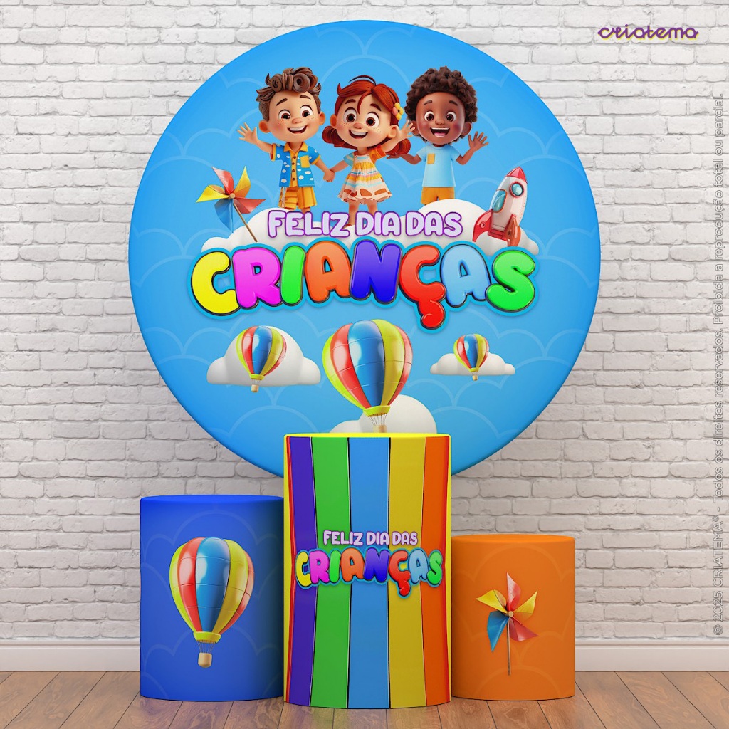 Trio Capas Cilindro E Painel Redondo Festa Decoração Dia das Crianças Sublimado Em Tecido