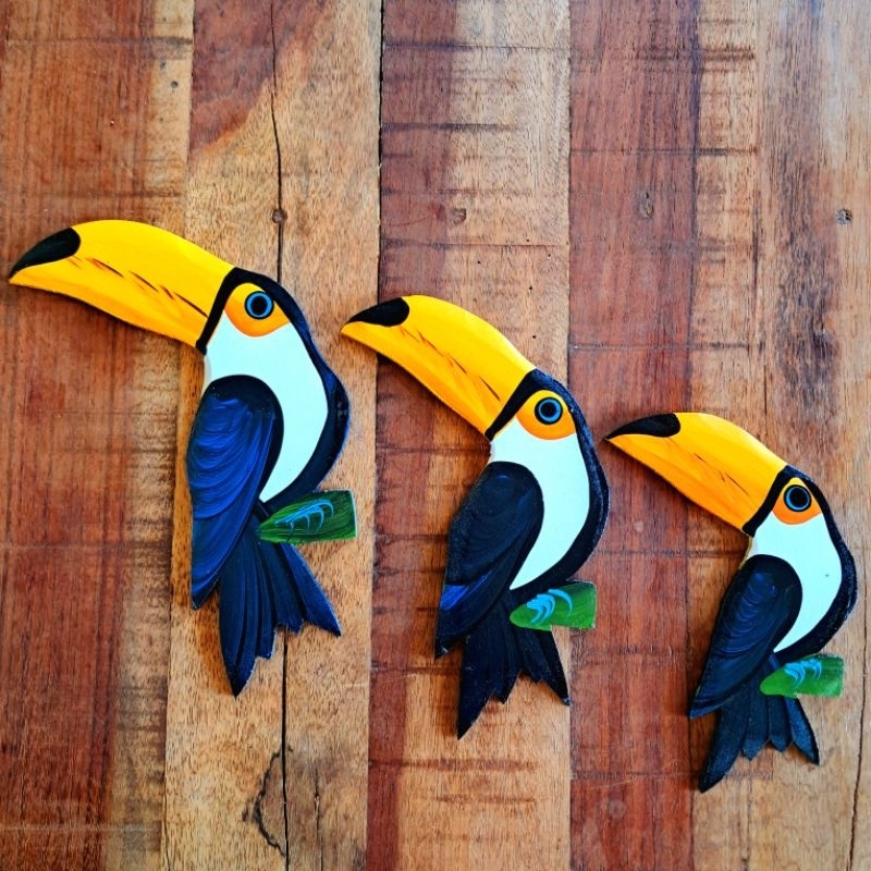 kit com 3 peças dos tamanhos diferentes. Conjunto de araras de madeira para decoração, ideal para enfeitar varandas, jardim e áreas externas, dando vida e cores a eles. Produto de origem artesanal, pintado à mão. Contém penduradores atrás das peças, pronto para fixar na parede. Material: MDF e tinta Trio Grande ( altura x largura x espessura): P: 21 cm altura M: 29 cm altura G: 35 cm altura Medidas do trio de tucanos: P: 17 cm altura M: 20 cm altura G: 23 cm altura Agora temos trios de tucanos G e GG ( medidas estao nas fotos.) Medida do quinteto de Araras: cada arara mede 20 cm