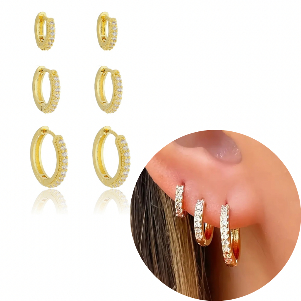 Trio De Argolas Femininas Cravejadas Brincos Banho Ouro 18k - Kit 3 Tamanhos Antialérgico Garantia