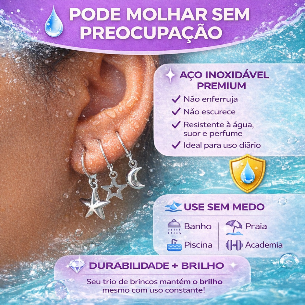 Trio de Brincos Argolinha Aço Inoxidável Cirúrgico Lua e Estrela Não Escurece Hipoalergênico