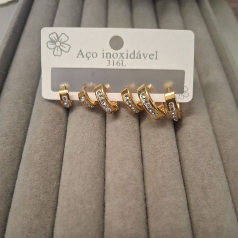 Trio de brincos Cravejados Argolinha em Aço ouro prata