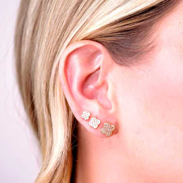 Trio de Brincos Mini Trevo Cravejado com Zircônias PMG Inspiração Virgínia Moda Estilo Elegância