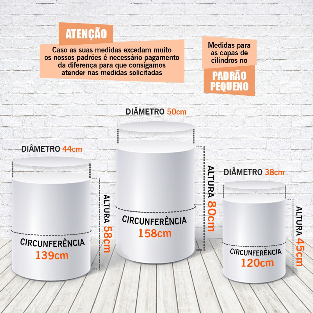TRIO CAPAS DE CILINDRO: O Trio de Cilindros é uma adição decorativa e versátil, ideal para elevar o ambiente de festas e eventos, proporcionando personalização e criando memórias inesquecíveis! Confira mais detalhes sobre este produto abaixo: FICHA TÉCNICA: - Material: Tecido Malha Poliéster Flexível 240g/ml - Composição: 95% Poliéster + 5% elástano - Acabamento: Costura em overlock nas laterais - Impressão: Os painéis são produzidos por meio da impressão sublimada com alta resolução, durabilidade e capacidade de reproduzir cores vivas e detalhes finos - Qualidade: Não reflete luz e não amassa - Garantia: Contra defeito de fabricação MEDIDA PADRÃO: Capas de Cilindros (03 unidades): - Cilindro grande: Altura: 80 cm X Diâmetro: 50 cm X Circunferência: 157 cm - Cilindro médio: Altura: 58 cm X Diâmetro: 44 cm X Circunferência: 141 cm - Cilindro pequeno: Altura: 45 cm X Diâmetro: 38 cm X Circunferência: 119 cm INFORMAÇÕES ADICIONAIS SOBRE O PRODUTO: - As cores dos painéis podem variar de tonalidade em 15% devido a resolução do monitor ou tela do celular, mas nada que interfira na qualidade do produto; - Possui efeitos com tecnologia em 3D; - Este kit de painel é do tipo veste-fácil, permitindo rápida instalação em estruturas de cilindros; - O produto NÃO acompanha a estrutura. INSTRUÇÕES DE LAVAGEM: - Utilize sabão neutro; - Não torça o tecido; - Não coloque em máquinas de lavar; - Para secar, vire do lado avesso em baixa temperatura; - Evite exposição direta ao sol. PRAZOS E ENVIO: - Nossos produtos são enviados para todo o Brasil com Nota Fiscal e embalagens personalizadas com a nossa marca. Cuidado com fraudes! - O prazo de entrega é estipulado pela plataforma, faça uma simulação de compra e verifique o prazo de entrega. ATENÇÃO CLIENTES: - Não fazemos alterações ou troca das imagens do anúncio; - Realizamos personalização de temas para clientes recorrentes. Caso tenha interesse em solicitar um desenvolvimento, entre em contato conosco; - Caso tenha divergência com seu produto, antes de efetuar devoluções ou cancelamentos, entre em contato conosco. AINDA FICOU COM ALGUMA DÚVIDA? Deixe sua pergunta ou entre em contato com a nossa equipe diretamente pelos canais de comunicação. Iremos te atender o mais rápido possível.