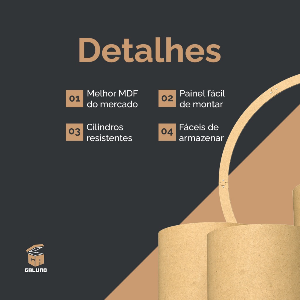 Atenção: Comprar apenas 1 kit devido o tamanho da embalagem, caso seja feita a compra de 2 kits ou mais não será possível enviar. Agradecemos pela compreensão! Os painéis e cilindros podem ser elementos decorativos muito vistosos e chamativos. Eles adicionam cor, estilo e personalidade à festa, criando um ambiente festivo e alegre. Produto resistente. Material: MDF de primeira linha Arauco. O produto é enviado desmontado, acompanha : Cola, parafusos, arruelas, porca borboleta e vídeo explicando a montagem! Especificações Técnicas: Painel Espessura Circulo Painel : 06.00mm Travas Painel : 06.00mm Espessura Pés Painel : 06.00mm Diâmetro Painel : 150 cm Altura Painel : 210 cm Trio de Mesas Espessura Lateral: 2.50 mm Espessura Fundo: 6.00 mm Espessura Tampa: 6.00 mm Cilindro grande: Altura: 80.00 cm Diâmetro: 50.00 cm Circunferência: 1580.00 mm Cilindro médio: Altura: 58.00 cm Diâmetro: 44.00 cm Circunferência: 1390.00 mm Cilindro pequeno: Altura: 45.00 cm Diâmetro: 38.00 cm Circunferência: 1200.50 mm Olha a Festa
