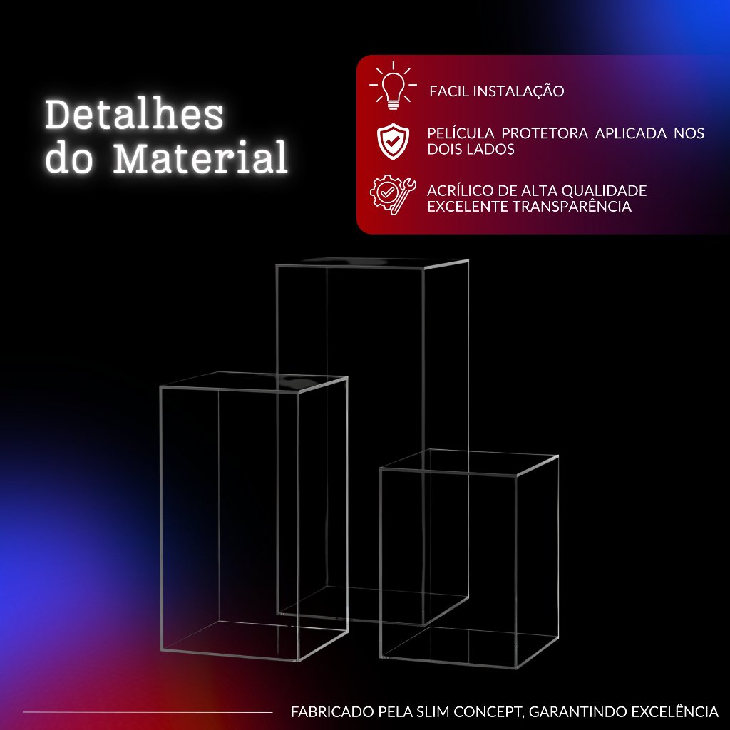 Nossos cubos são totalmente fixo e cantos dobrados , NÂO SÂO DESMONTADOS As peças são totalmente transparentes, Dobradas, muito resistentes. Kit de 3 (três) cubos de ACRÍLICO de alta qualidade, 100% puro, não amarela com o tempo e pode ser usado ao ar livre. Transforme sua próxima celebração com o Kit Cubos em Acrílico da Slim Concept. Este conjunto inclui três cubos elegantes de 80, 60 e 40 cm, perfeitos para dar um toque sofisticado em decorações de aniversários e festas. Fabricados em acrílico resistente de 3 mm, esses cubos possuem um design versátil que se adapta a diversas temáticas, garantindo que sua decoração seja um destaque. Ideal para uso em estúdios fotográficos e eventos especiais, esses cubos dobrados oferecem uma base estável para qualquer arranjo que você desejar. A sua durabilidade e estética moderna fazem deles uma escolha inteligente para quem busca qualidade e estilo em cada detalhe da sua festa. Aproveite a oportunidade de transformar seu evento em uma experiência memorável com um toque de criatividade que os cubos em acrílico proporcionam. Material: Acrílico 3mm Dimensões: Cubo 1 : 40 (altura) x 36 x 36 cm Cubo2 : 60 (altura) x 38 x 38 cm Cubo 3 : 80 (altura) x 40 x 40 cm Fácil instalação Os cubos são enviados com película protetora, o comprador deverá retirar quando receber. Acompanha Caixa de MDF para transporte Limpeza: Limpar apenas com flanela seca ou lustra móveis. Capacidade: 10 kg Garantia de Fabrica Fabricação própria , ótimo atendimento pôs vendas