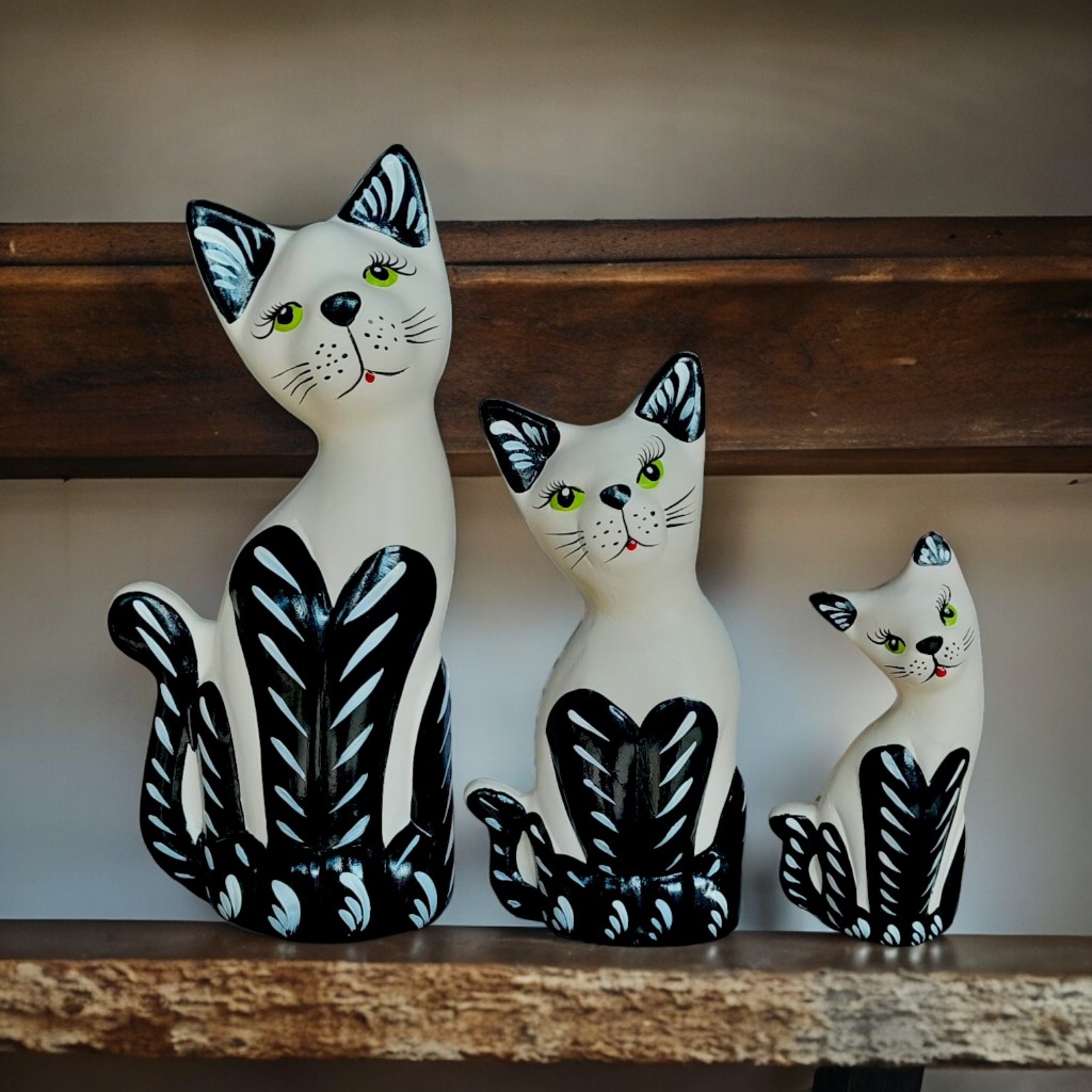 Trio de Gatos Decorativos Cerâmica Decoração Casa Sala Rack Rústico