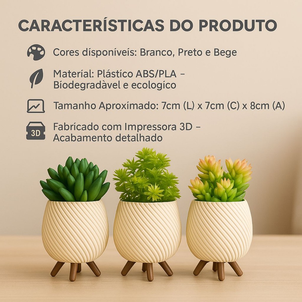 Vasinho Cachepot Decorativo com Pezinho - Minimalista & Delicado Este pequeno e elegante vaso decorativo é perfeito para dar um toque especial a qualquer espaço, trazendo um ar moderno e acolhedor. Ideal para pequenos arranjos, suculentas ou até mesmo vazio como peça decorativa, ele combina com diversos estilos de decoração, desde o minimalista ao boho. O que você recebe: Vaso Cachepot disponíveis nas cores Preto, Branco & Bege Cada unidade de Vasinho acompanha um Pezinho/Suporte Especificações do Produto: Cor do Vasinho: Branco / Preto e/ou Bege Cor da Base: Marrom Material: Plástico ABS/PLA durável - Material biodegradável produzido através de fontes renováveis Altura do Vaso: 7cm x 7cm x 8cm (Largura x Comprimento x Altura) Montagem: Seu Kit já vem Prontinho Dicas de uso: - Posição em locais seguros e acessíveis: Evite colocar em prateleiras ou superfícies muito altas para garantir segurança, coloque os vasinhos em superfícies mais baixas e seguras, como mesas ou aparadores, para evitar quedas. Renove seu espaço com elegância e personalidade. O Vasinho Cachepot Decorativo com Pezinho é a escolha ideal para quem busca decorar com praticidade e bom gosto. NÃO ACOMPANHA AS PLANTAS. Peças fabricadas através de impressoras 3D. Imagens registradas originais de nossos produtos.
