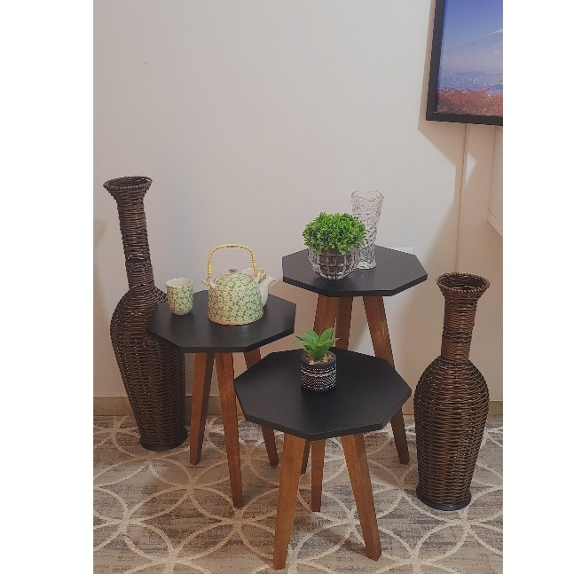 O Trio de Mesas Decorativas é uma ótima opção para decorar ambientes em sua casa, esse modelo é todo pintado na cor PRETO FOSCO, gerando bastante destaque no momento de decorar salas, quartos, escritórios, salões, clínicas etc. - NÃO ACOMPANHA OS ENFEITES DAS FOTOS, FOTOS ILUSTRATIVAS! ** *** O MANUAL DE MONTAGEM ESTÁ NAS FOTOS DO PRODUTO E TABELA DE MEDIDAS TAMBÉM Especificações: MAIOR: - Mesa de 35x57 - Altura: 53CM - Comprimento: 35 Ø CM - Espessura Mdf: 15 mm MEDIA: - Mesa de 35 x 47 - Altura: 43CM - Comprimento: 35 Ø CM - Espessura Mdf: 15 mm MENOR: - Mesa de 35 x 43 - Altura: 38CM - Comprimento: 35 Ø CM - Espessura Mdf: 15 mm Tampo na cor: preto Conteúdo da embalagem: -9 Pés em madeira: 3 em 55 CM, 3 em 45 CM e 3 em 40 CM ( NA COR AMENDOA) - Obs. Variação de cor dos pés podem ocorrer por serem em madeira de Reflorestamento, por sua tela do computador também, a foto varia um pouco! O conjunto vem com 9 peças de PLASTICO para fazer a fixação no tampo e nos pés, e parafusos para fixação,. - NÃO ACOMPANHA OS ENFEITES DAS FOTOS, FOTOS ILUSTRATIVAS!