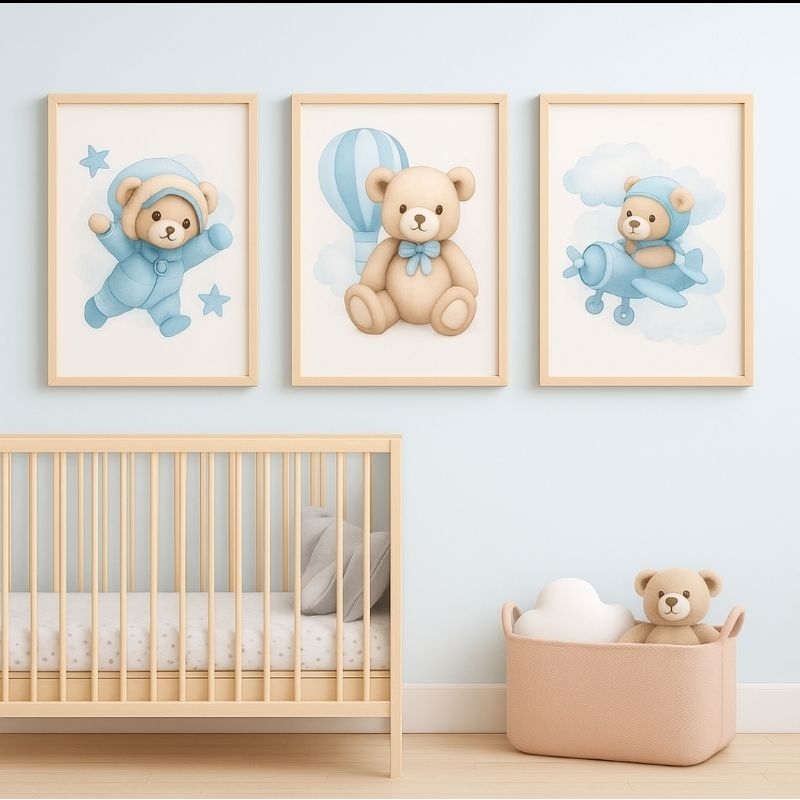 Trio Quadros Decorativos Infantil Ursinho Meigo Balão Avião Detalhes Azuis Borda Bege Decoração
