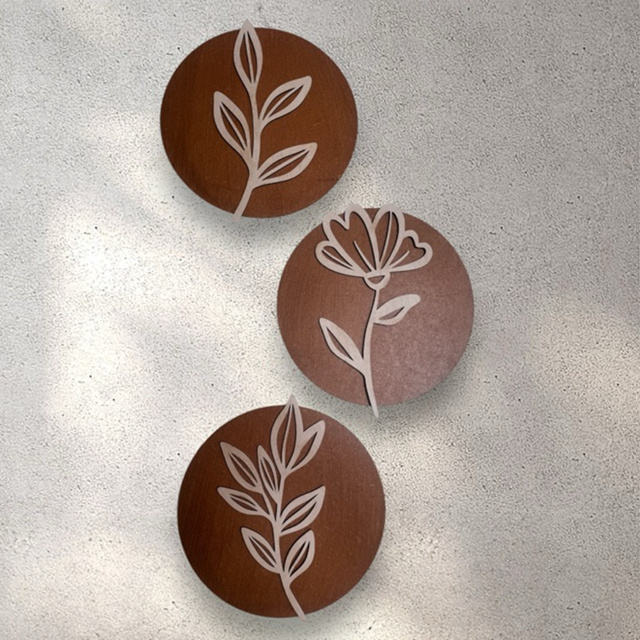 Trio Quadros Redondos Decorativos Moderno Decoração Mdf Flor Folhagem