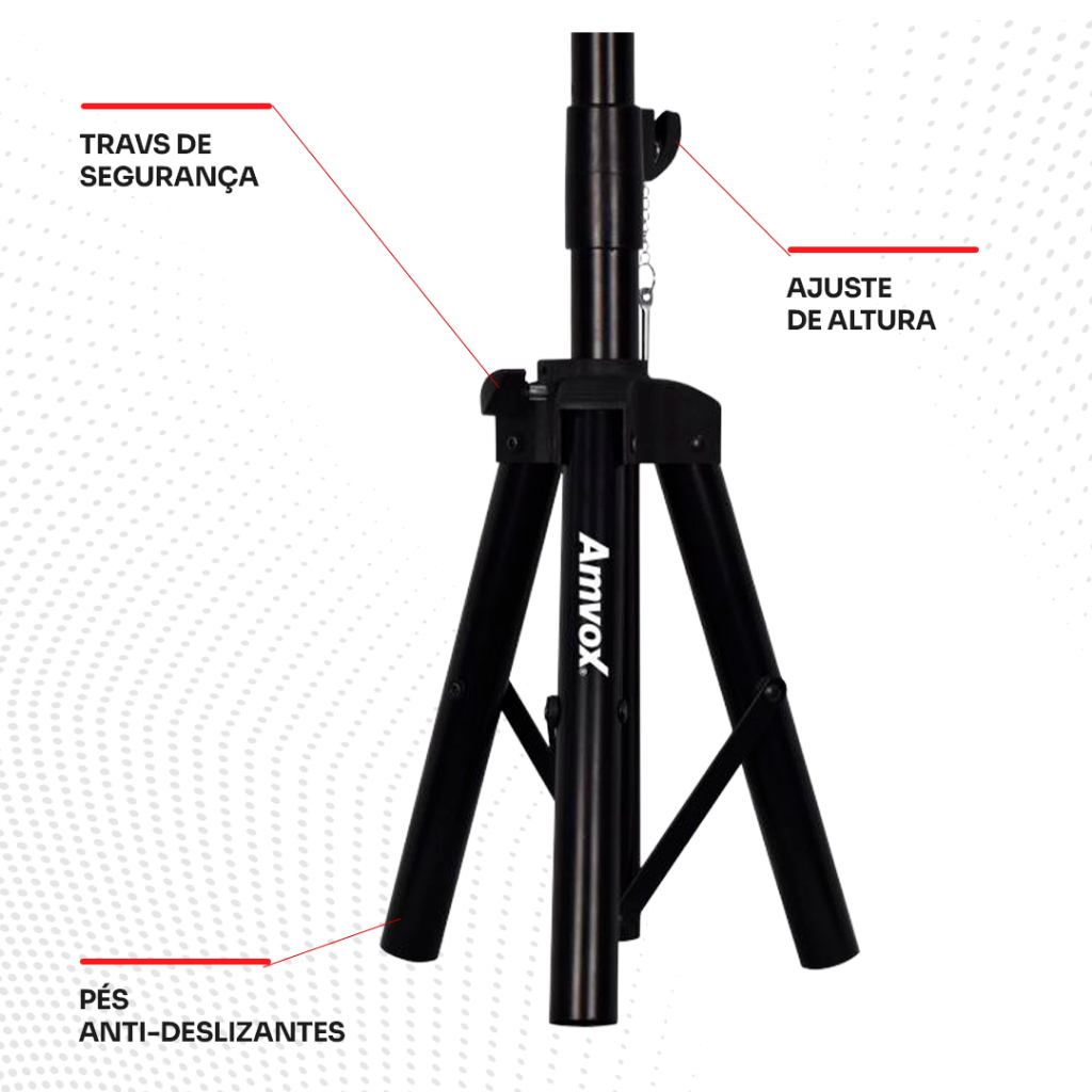 Tripé em Metal Regulamento de Altura AMVOX ATP 001 Itens Inclusos - 01 Suporte Tripé para Caixa Acústica Suporte Tripé para Caixa Acústica com rotação horizontal de até 360º. Ideal para ambientes escolares, empresariais, palestras, lojas e até mesmo para momentos de lazer. Maior economia de espaço, flexibilidade e praticidade Características: - Estrutura em aço laminado com revestimento em pó durável de alta tecnologia - Compatível com Caixas de Som Acústicas Passivas e Ativas - Plataforma pré-montada que permite uma instalação simples - Oferece opções de alturas flexíveis para atender às suas necessidades - Trava de segurança - Pés emborrachados - O produto é compatível com caixas que tenham o encaixe de tripé na parte inferior. Informações Técnicas: - Ajuste máximo: 360 graus horizontal - Material: Aço laminado com revestimento em pó durável, acabamento em PVC - Tamanho do suporte: Altura máxima - 89,5 cm / Altura minima - 52 cm - Tamanho do produto (LxAxC): 12x52x12 cm - Tamanho da embalagem (LxAxC): 13x12x53 cm - Peso do tripé: 1,3 kg - Suporta até 12 kg