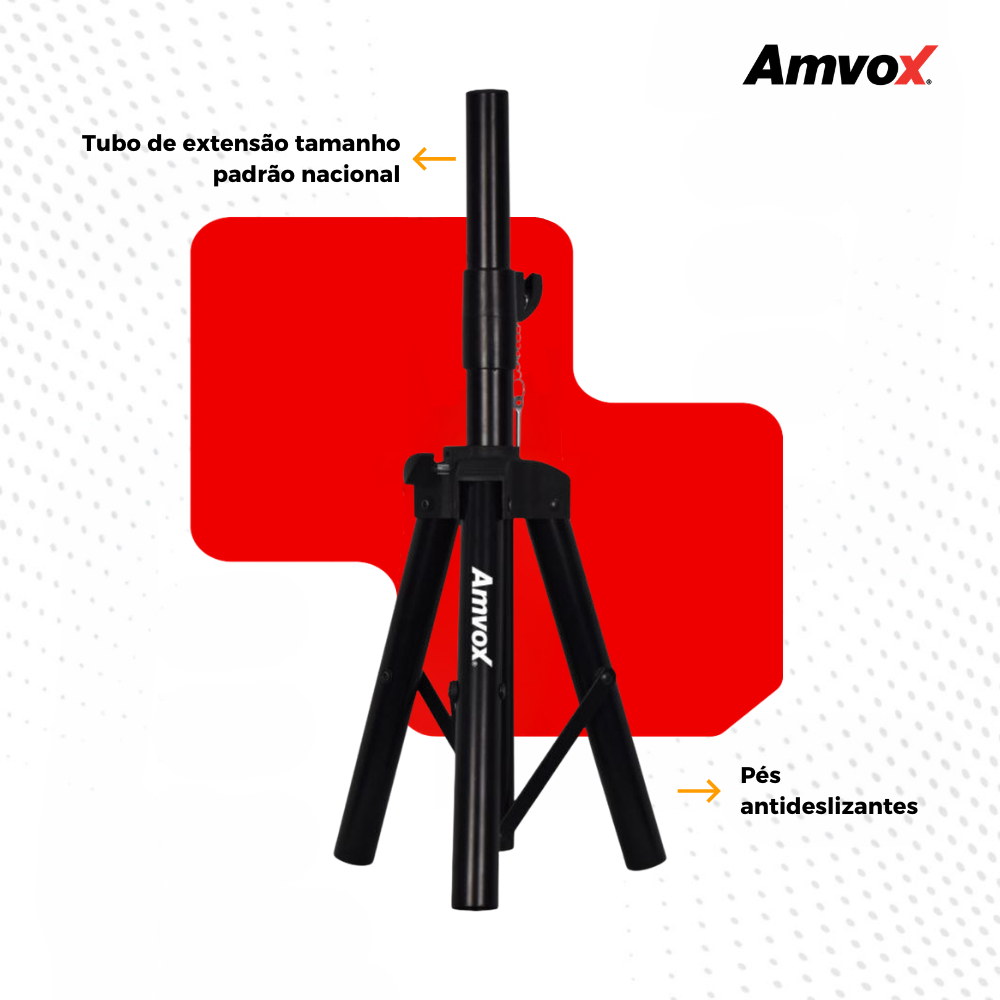 Tripé em Metal Regulamento de Altura AMVOX ATP 001 Itens Inclusos - 01 Suporte Tripé para Caixa Acústica Suporte Tripé para Caixa Acústica com rotação horizontal de até 360º. Ideal para ambientes escolares, empresariais, palestras, lojas e até mesmo para momentos de lazer. Maior economia de espaço, flexibilidade e praticidade Características: - Estrutura em aço laminado com revestimento em pó durável de alta tecnologia - Compatível com Caixas de Som Acústicas Passivas e Ativas - Plataforma pré-montada que permite uma instalação simples - Oferece opções de alturas flexíveis para atender às suas necessidades - Trava de segurança - Pés emborrachados - O produto é compatível com caixas que tenham o encaixe de tripé na parte inferior. Informações Técnicas: - Ajuste máximo: 360 graus horizontal - Material: Aço laminado com revestimento em pó durável, acabamento em PVC - Tamanho do suporte: Altura máxima - 89,5 cm / Altura minima - 52 cm - Tamanho do produto (LxAxC): 12x52x12 cm - Tamanho da embalagem (LxAxC): 13x12x53 cm - Peso do tripé: 1,3 kg - Suporta até 12 kg