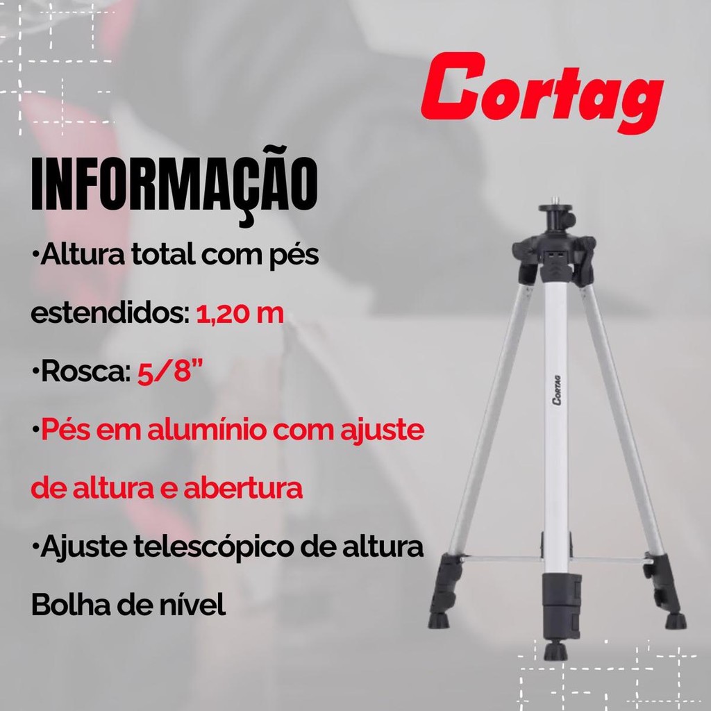 Tripé Para Nível A Laser Tra 500 Cortag ......................................................................................................................... O Tripé para Nível a Laser TRA 500 Cortag é ideal para quem necessita de dinamismo e precisão na hora de fazer os nivelamento a laser! Com ele, o usuário poderá utilizar os níveis em alturas de até 120cm e transportar com facilidade graças a bolsa para acondicionamento ......................................................................................................................... PRINCIPAIS CARACTERISTICAS ......................................................................................................................... Produto - Tripé Manual MarcaCortag ModeloTRA-500 Uso Indicado - Para estabilizar equipamentos de medição. Distância do Alcance Máximo - 1,20 m Cor do Laser - Verde (Ambientes Externos e Internos) e Vermelho (Ambientes Internos) Quantidade de Bolhas 1 bolha(s) Possui Imã- sem Imã Material - Metal e Plástico Tipo de Material - Aço Carbono e Polipropileno Altura 570,00 cm Largura110,00 cm Profundidade 110,00 cm Comprimento 570,00 cm Dimensão 570x110x110 cm Altura em Polegadas 22.4/9 " Largura em Polegadas4.1/3 " Profundidade em Polegadas 4.1/3 " Comprimento em Polegadas 22.4/9 " Dimensão em Polegadas 22.4/9x4.1/3x4.1/3 " Contém na Embalagem1 Tripé para Nível a Laser TRA 500 Cortag ................................................................................................................................ MAIS INFORMAÇÕES Nivelamento preciso: O Tripé para Nível a Laser do modelo TRA 500, da Cortag, é ideal para quem necessita de dinamismo e precisão na hora de fazer os nivelamentos a laser. Com ele, o usuário poderá utilizar os níveis em alturas de até 120 cm de distância. Materiais de qualidade: O produto possui dimensão de 570 mm de altura, 110 mm de largura e profundidade e 570 mm de comprimento. Ele é feito com aço carbono e plástico polipropileno, materiais que são muito resistentes. Fácil transporte: O item é feito nas cores prata e preto e é entregue com uma bolsa de acondicionamento que facilita o transporte para qualquer lugar de forma prática. Item possui bolha que garante nivelamento perfeito! Para ajudar no nivelamento ideal, o produto possui uma bolha para garantir que o nível seja perfeito e não cause danos à obra. O Tripé para Nível a Laser TRA 500, da Cortag, é essencial para alinhar as linhas horizontais e verticais de uma obra ou projeto da construção civil. Ele também ajuda na instalação de portas, janelas, quadros e prateleiras. ................................................................................................................................ DÚVIDAS FREQUENTES ................................................................................................................................ Pergunta: Como é embalado o produto? Resposta: Todos os nossos produtos vendidos são embalados em caixas lacradas ou plástico stretch. Em respeito ao meio ambiente 90% das caixas são reutilizadas. Pergunta: Quem faz a entrega? Resposta: A entrega é terceirizada, feita via CORREIOS ou TRANSPORTADORA. Pergunta: O envio é feito em quantos dias? Resposta: Nós enviamos o seu pedido no prazo máximo de 24 horas após a confirmação de sua compra, sendo um dos envios mais rápidos da plataforma. Pergunta: Os produtos são novos ou usados? Resposta: Todos os produtos que trabalhamos são novos, Originais e com qualidade garantida. ............................................................................................................................ .#tripéparabanner #tripemanfrotto #tripesachtler #portabanner #tripebenrokh25n #ulanzitripe #pedestalportabanner#tripecamera#tripeprofissional#kityoutuber#pedestaltripe