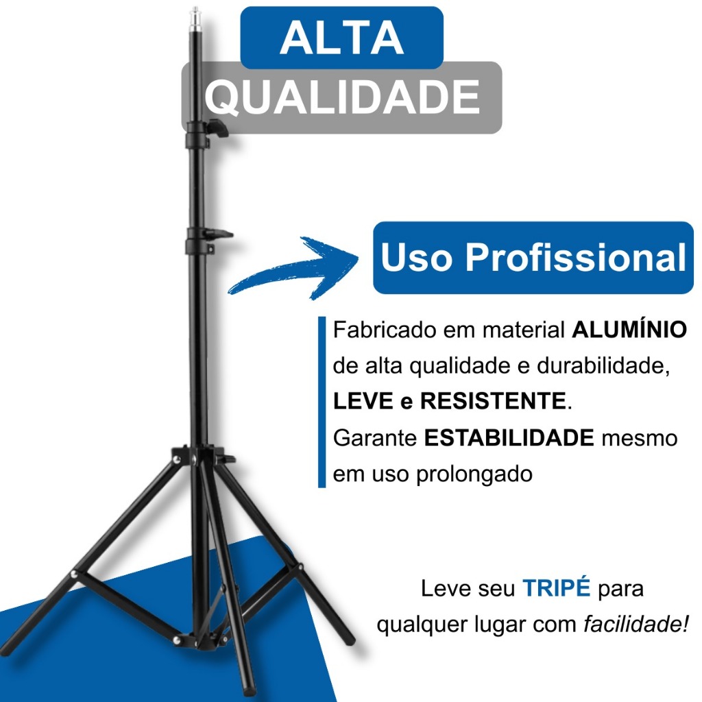 Tripé telescópico, prático e útil com acabamento excelente Tripé - Elaborado especialmente para ser utilizado com o nível a laser. É feito de liga de material leve que garante a sua leveza. As posições do suporte são equipadas com fechaduras especiais permitindo ajustar a altura. Pode ser usado em câmeras também possui um parafuso de 1/4 que é encaixe universal de qualquer câmera e nível a laser ESPECIFICAÇÕES: Dispositivos Compatíveis: projetor, webcam, celular/smartphone, iPhone, câmeras, ringlight e holofote de led Comprimento mínimo: 70cm Comprimento máximo: 210cm Comprimento base aberta: 60cm Suporta peso de até: 4kg Peso: 555 Gramas Cor: Preto Compatível com: Ring Light Celulares Smartphones | Iphones Tablets | Ipad Câmera DSLR | Profissional Webcam Câmeras de ação | GoPro Monitores (FeelWorld) Holofotes | Luminárias com encaixe 1/4 rosca Filmadoras Microfones com rosca Bastão de Led Nível a Laser (Construção Civil )