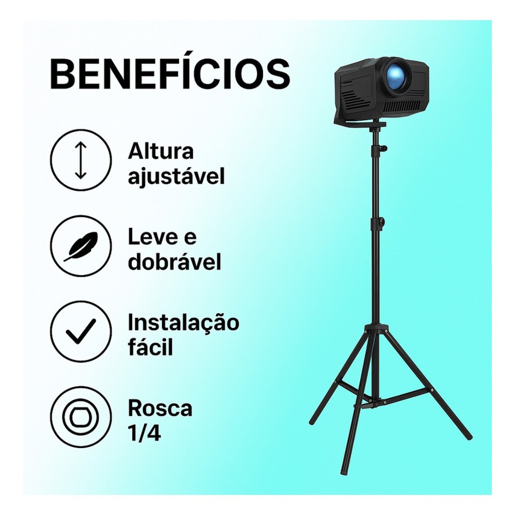 Tripé Universal Suporte para Projetor Portátil Hy300 Hy320 A Escolha Ideal para Apresentações Profissionais e Sessões de Cinema em Casa O Tripé Hy300 Hy320 é a solução perfeita para quem busca praticidade, versatilidade e segurança ao projetar imagens e vídeos. Fabricado com um design robusto e moderno em alumínio, esse suporte é projetado para suportar até 4 kg, garantindo estabilidade e durabilidade, mesmo durante longas sessões de uso. Com altura ajustável de 65 cm até 2 metros, você tem total controle sobre a posição do seu projetor, podendo adaptá-lo facilmente à altura ideal para cada tipo de apresentação, seja em um ambiente profissional ou em sua sala de estar para uma noite de cinema. Além disso, o grau de inclinação, rotação de 360° e o giro de 90° permitem ajustes rápidos e precisos no ângulo de projeção, garantindo flexibilidade total para exibir imagens de forma clara e nítida de qualquer posição. Com apenas 500 g de peso e dimensões compactas de 8 cm x 8 cm, o Hy300 Hy320 é leve e fácil de transportar, perfeito para quem está sempre em movimento. Seu design funcional também facilita o armazenamento, tornando-o a opção ideal para quem precisa de um tripé portátil, sem abrir mão da robustez e confiabilidade. Se você procura um suporte de qualidade, prático e eficiente, o Hy300 Hy320 é a escolha certa para levar suas apresentações e experiências de projeção a um novo nível. Garantia do vendedor: 30 dias