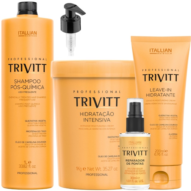 Reparador de Pontas Itallian Trivitt Reparador de Pontas é um reparador de pontas para todos os tipos de cabelo. Recupera o brilho, repara as pontas duplas e condiciona os fios. A tecnologia com silicones de Itallian Trivitt Reparador de Pontas forma uma película que protege o cabelo e deixa os fios macios e com brilho luminoso sem que eles fiquem pesados ou oleosos. Hidratação Intensiva 1kg Itallian Trivitt Hidratação Intensiva é indicada para todos os tipos de cabelo. Repara os danos com hidratação, brilho e condicionamento dos fios. Penetra na parte interna da fibra capilar e fortalece os fios contra a quebra com ingredientes altamente hidratantes, que atuam no selamento das cutículas e na reposição da hidratação perdida por mais tempo, que deixa o cabelo com brilho, resistente e condicionado. Shampoo Pós-Química para Uso Frequente 1l Itallian Trivitt Shampoo Pós Química para uso frequente foi desenvolvido para cabelos quimicamente tratados. Repara os danos, repõe a hidratação e proporciona brilho e fios macios. Limpa sem ressecar e deixa o cabelo mais fácil de pentear após escovas progressivas, alisamentos, relaxamentos, coloração e descoloração por recuperar as agressões da química com hidratação, emoliência e reparação para um sensorial macio e fios com brilho. Leave-in Hidratante Itallian Trivitt Leave-in Hidratante é indicado para todos os tipos de cabelo. Reduz o volume com hidratação e condicionamento sem pesar nos fios. Protege do frizz ao longo do dia e conserva a hidratação no interior da fibra por mais tempo para que o cabelo fique macio, desembaraçado e com brilho.