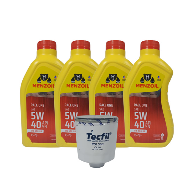Conteúdo Da Embalagem: 04 Litros de Óleo 5w40 Sintético API SN VW 508.88 Menzoil 1 Filtro óleo Tecfil Psl560 1 Etiqueta Controle de Óleo Menzoil **Acompanha Nota Fiscal e etiqueta de quilometragem para marcar a troca de óleo do seu carro** **Produtos à pronta entrega ** Aplicação: VOLKSWAGEN Cross Fox 1.6 8V 104cv 2010 2017 (I-Motion / Urban White) - automático / mecânico Total Flex Fox 1.0 4cil. 8V 76cv 2010 2015 (MI / Trend / Sunrise) - mecânico Total Flex Fox 1.6 8V 103cv 2010 2017 (MI / Imotion / Extreme / BlueMotion / Prime) Total Flex Gol 1.0 8V 76cv 2011 2015 G5 / G6 - MI / Black / Ecomotion / Track - mecânico Total Flex Gol 1.6 8V 104cv 2008 2015 G5 / G6 / MI / Power / Imotion / Rallye - mecânico Total Flex Golf 1.6 8V 104cv 2012 2014 MI / Tech / Flash / Sportline - mecânico Total Flex Polo 1.6 8V 104cv 2007 2013 (G4 e G5 - BlueMotion / Imotion / Sportline) - automático / manual Total Flex Saveiro 1.6 8V 104cv 01/2014 > (Rock in Rio/Surf/Startline/Trendline) Flex SpaceFox 1.6 8V 04/2008 > Flex Voyage 1.0 8V 01/2008 2015 TOTAL FLEX Flex Voyage 1.6 8V 105cv VHT 09/2008 12/2015 Flex DESCRIÇÃO Com aprovação VW 508.88\509.99, desenvolvido para atender requerimentos especiais de montadoras para seus modelos mais modernos e de alto desempenho. Atende especificações: API SN / ACEA A3/B4 (2016) / VOLKSWAGEN VW 50999 / VOLKSWAGEN VW 50888 / Daimler MB 229.5 / Daimler MB 226.5 / Renault RN 0710 / Renault RN 0700 / Porsche A40 Benefícios x Características: Ajuda a proteger os motores de alta performance da formação de depósitos que prejudicam o desempenho e a eficiência do motor. Ajuda a remover os depósitos de borra deixados por lubrificantes inferiores Baixo consumo de óleo. AutoStileMotors.