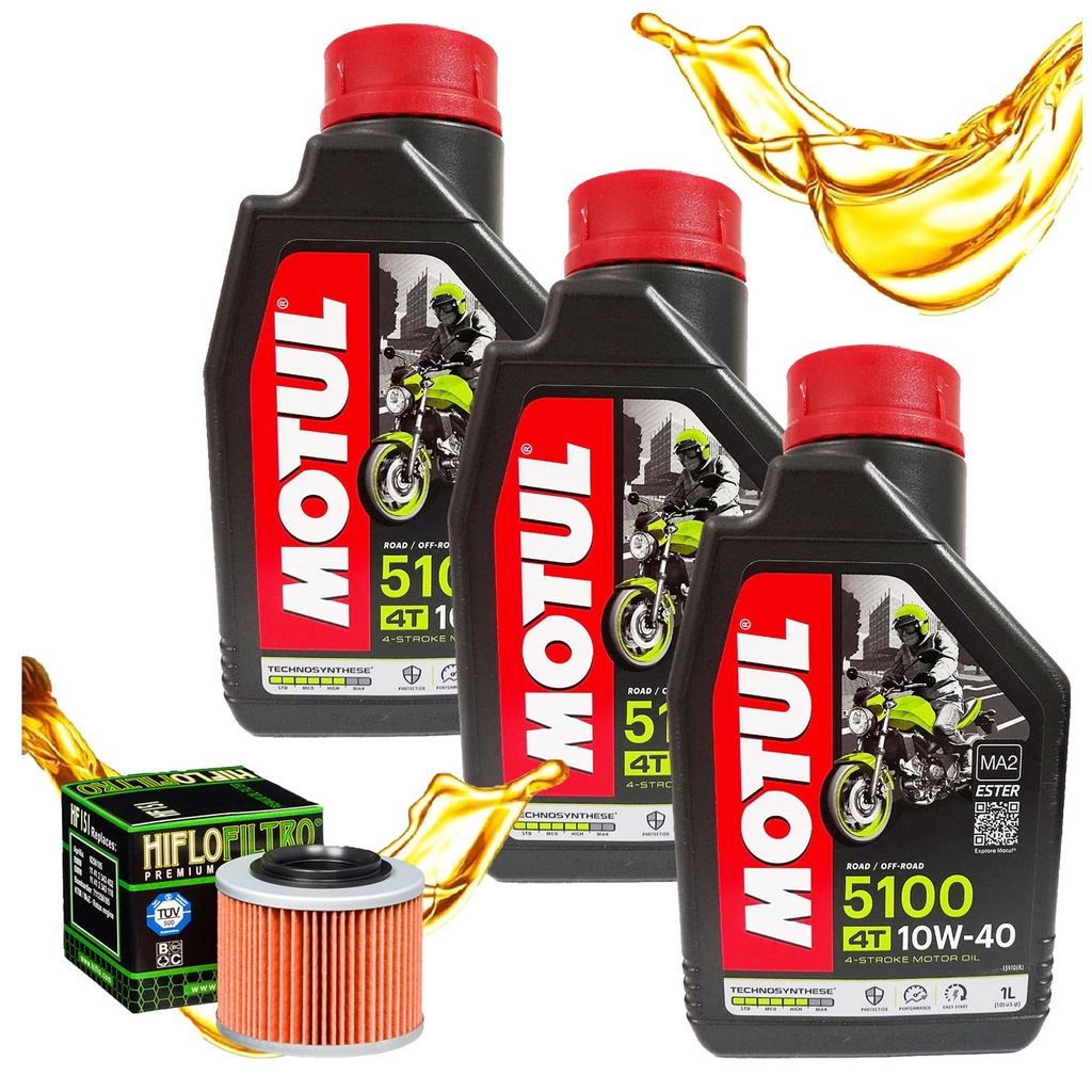 Kit Troca de Óleo Aumente a vida útil de sua moto. Praticando uma manutenção rigorosa do sistema de lubrificação, trocando o óleo e o filtro de óleo regularmente você estará estendendo a vida do motor, evitando desgaste excessivo das partes móveis, aumentando o desempenho e reduzindo o consumo de combustível. Conteúdo da Embalagem: 03 Frascos de 1 Litro de Óleo Motul 10W40 Semissintético 01 Filtro de Óleo HIFLO Algumas Aplicações: BMW F650 CSK14 / E650C 02-05 F650 Funduro 169 93-96 F650 Funduro E169 MU 97-00 F650 GSR13 00-04 F650 GSE650G 05-07 F650 GS Dakar R13 01-04 F650 GS Dakar E650G 05-07 F650 ST Strada 169 97-00 F650 Eunduro 169 93-96 F650 Eunduro E169 MU 97-00 F650 ST Strada 169 97-00 F650 GS R13 00-04 F650 GS E650G 05-07 F650 CS K14 / E650C 02-05 G650 GS 09-11 G650 GS 12-16 G650 GS Sertao 11-14 G650 Xchallenge 07-08 G650 Xcountry 07-08 G650 Xmoto 07-08 Especificações Óleo Motul: - Óleo Motul 5100 10w40 Semissintetico 4 Tempos - Aplicação: Lubrificantes para Motor - Tipo de Motor: 4 Tempos - Qualidade: TECHNOSYNTHESE® - Cor: Âmbar - Grau de viscosidade: 10w40 - Contém Fosforo e Enxofre otimizado - Atende as normas API SM / SL / SJ / SH / SG - Homologações: JASO MA2 con N° M033MOT114 - Outras aplicações: Motos sem sistema catalítico, scooters, quads, ciclomotores - Pode ser misturado com outros tipos de óleos sintéticos ou minerais. -Número de Registro ANP: 22.297 Technosynthese® (Semi-sintético) lubrificante para motos 4 tempos ? Tecnologia Ester - Atende as especificações dos fabricantes de motocicletas, especialmente HONDA que recomenda SAE 10W30 visando aumento da economia de combustível. Melhor resistência ao cisalhamento possibilitando troca de marchas suaves. Atende às especificações JASO MA2 para um ótimo desempenho da embreagem úmida. Adequado para catalisadores. Vantagens do Filtro Hiflo: - Protege o motor; - Prolonga sua vida útil; - Proporciona segurança; - Permite uma lubrificação mais eficaz; - Proporciona melhor rendimento do motor e precisão de funcionamento; - Contribui na economia de combustível; - Contribui para a redução de emissão de poluentes na atmosfera. Importante: Recomendamos que a instalação seja feita por profissional especializado e não nos responsabilizamos pelo mau uso do produto.