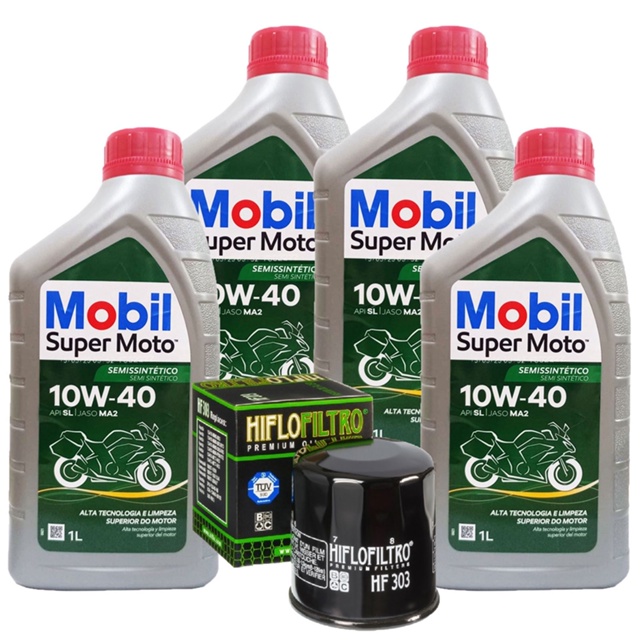 Kit Troca de Óleo Aumente a vida útil de sua moto. Praticando uma manutenção rigorosa do sistema de lubrificação, trocando o óleo e o filtro de óleo regularmente você estará estendendo a vida do motor, evitando desgaste excessivo das partes móveis, aumentando o desempenho e reduzindo o consumo de combustível. Conteúdo da Embalagem: 04 Frascos de 1 Litro de Óleo Mobil Semissintético 10W40 01 Filtro de Óleo HIFLO Aplicação Ideal Motos Kawasaki Ninja 1000 Ninja ZX 10R Ninja ZX 10RR Ninja ZX6R Ninja ZX6R 636 Versys 1000 Vulcan 900 Z 1000 Z 750 Z 800 Z 900 Especificações Óleo Mobil 10w40: - Veículos: Especialmente formulado para veículos flex. - Tipo de motor: 4 Tempos - Viscosidade: 10W-40 - Classificação: Semissintético - Atende ou excede:JASO MA-1, JASO MA-2, API SJ - Excelente proteção antidesgaste; - Boa estabilidade térmica, antioxidante e de controle de depósitos (borras); - Excelentes propriedades de proteção anticorrosiva; - Aprimoradas propriedades em operaçõessob baixas temperaturas; - Prolonga a vida útil dos componentes do motor e a vida útil do motor como um todo; - Os motores operam de forma mais limpa resultando em operação suave e sem falhas; - Prolongada vida útil dos comandos de válvulas e componentes de mancais; - Partidas mais fáceis sob temperaturas mais baixas,prolongada vida útil do sistema elétrico. - Número de Registro ANP: 16601 Especificações Filtro HIFLO: - Fabricado em Metal e Borracha Resistente - Número da Peça: HF303 - Possui Válvula Anti-Dreno, Desvio e Alívio PSI - Para Uso de Óleo Mineral, Sintético e Semi-sintético - Projetado Para Suportar Pressões Internas Elevadas - Garante Melhor Circulação do Óleo e Proteção ao Motor - Maior Resistência a Pedras e Detritos que Podem Atingir a Moto - Borracha de Vedação Pré-Lubrificada - Substitui o Filtro de Óleo Original - Fácil Instalação - Qualidade Reconhecida HIFLO FILTRO Importante: Recomendamos que a instalação seja feita por profissional especializado e não nos responsabilizamos pelo mau uso do produto.