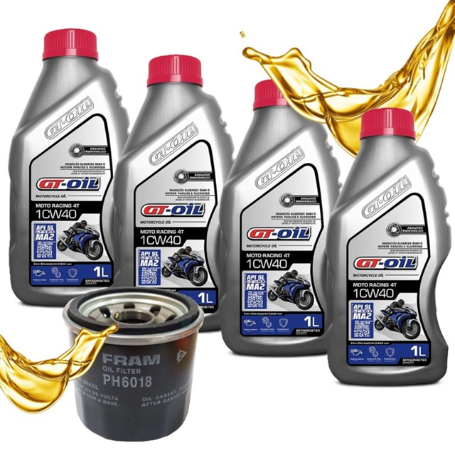 Troca de Óleo Gt Oil 10W40 + Filtro Aumente a vida útil de sua moto. Praticando uma manutenção rigorosa do sistema de lubrificação, trocando o óleo e o filtro de óleo regularmente você estará estendendo a vida do motor, evitando desgaste excessivo das partes móveis, aumentando o desempenho e reduzindo o consumo de combustível. Compatibilidade Ideal: SUZUKI: GSX-R 750 SRAD 750 - Todos GSX-R 1000 SRAD 1000 - Todos GSX-R 600 SRAD 600 - Todos GSX-S 750 - Todos GSX 1300 R Hayabusa - Todos Vstrom 1000 - Todos Boulevard - Todos Bandit 1250 - Todos Bandit 1200 - Todos Bandit 650 - Todos GSR 750 - Todos GSX 650F - Todos GSX 1300R B-King - Todos GSX 600F Katana - Todos GSX 750F Katana - Todos APRILLIA: RSV 1000 - Todos RSV4 - Todos Conteúdo da Embalagem: 04 Litros de Óleo Gt Oil 10w40 Semissintético 01 Filtro de Óleo Fram PH6018 Código Original (OEM) do Filtro: 16510-34E00 / 16510-03G00 Especificações Técnicas do Filtro: - Marca Fram - Modelo: PH6018 - Altura : 65 mm - Diâmetro externo: 69 - Válvula de Segurança (By Pass): Sim - Válvula Anti-Retorno: Sim - Alta Qualidade - Máxima Eficiência - Possui Válvula Anti-Dreno, Desvio e Alívio PSI Especificações do Óleo: - Normas: API SL, JASO T903:23 (MA2) - Viscosidade: SAE 10W40 - Aplicação: Lubrificante para motores - Tipo de motor: 4 tempos - Qualidade: Semissintético - Proteção para o motor e o sistema de transmissão - Atende às especificações JASO MA/MA2 para um ótimo desempenho da embreagem úmida - Número de registro de produto de ANP: 23.011 Propriedades Físico Químicas do Óleo: - ASTM D-1500 Cor 3,0 - ASTM D-4052 Densidade à 20/4°C 0,86 - ASTM D-445 Viscosidade cSt à 100°C 15,5 - ASTM D-445 Viscosidade cSt à 40°C 134,6 - ASTM D-2270 Índice de Viscosidade 120 - ASTM D-92 Ponto de Fulgor, vaso aberto (COC) °c 230 - ASTM D-97 Ponto de Fluidez, °C -33 - ASTM D-2869 TBN, mg KOH/g 6,5 - ASTM D-130 Corrossividade ao cobre 3h a 100°C 1b Benefícios do Óleo : - Adequado funcionamento da embreagem - Eficiente limpeza do motor - Maior vida útil aos catalisadores - Proteção a altas temperaturas Benefícios do Filtro: - Proteção do motor - Prolonga a vida útil do motor - Melhora o desempenho do motor - Evita danos ao motor - Garante a lubrificação adequada Os filtros Fram são reconhecidos por sua qualidade e durabilidade!! Importante !! - Recomendamos que a troca seja feita por um profissional de sua confiança! - Ao descartar o produto, tenha o devido cuidado com o meio ambiente. - Em caso de dúvidas, entre em contato através dos nossos canais de atendimento.