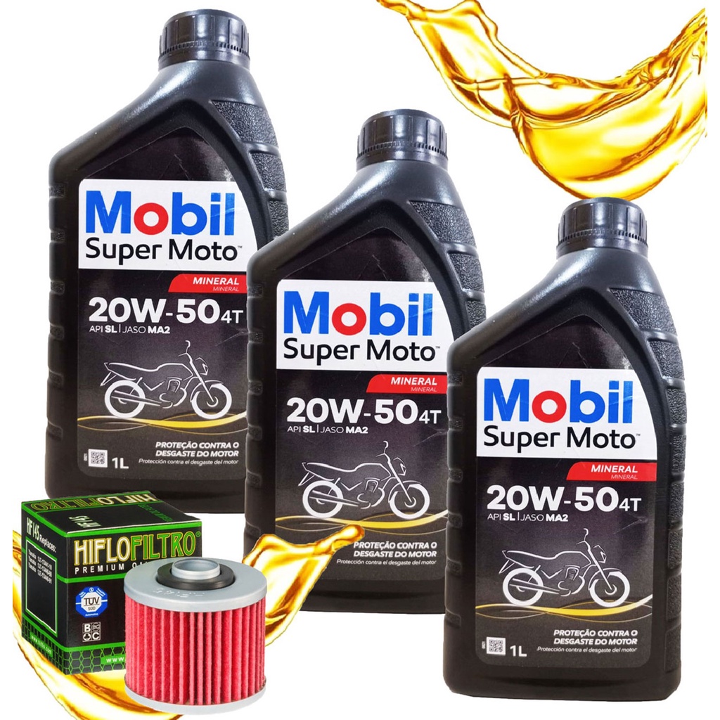 Kit Troca de Óleo Aumente a vida útil de sua moto. Praticando uma manutenção rigorosa do sistema de lubrificação, trocando o óleo e o filtro de óleo regularmente você estará estendendo a vida do motor, evitando desgaste excessivo das partes móveis, aumentando o desempenho e reduzindo o consumo de combustível. Conteúdo da Embalagem: 03 Frascos de 1 Litro de Óleo Mobil Mineral 20w50 01 Filtro de Óleo Hiflo Algumas Aplicações: YAMAHA XT 600 XT 600 Z Tenere XT 660 XTZ 660 Tenere Virago 250 Virago 535 Virago 1100 Especificações Óleo Mobil: - Aplicação: Lubrificantes para Motor - Qualidade: Mineral - Tipo de motor: 4 Tempos - Viscosidade: 20W50 - Atende ou excede: JASO MA; JASO MA2; API SL. (as mais exigentes classificações mundiais para motores a gasolina.) - cSt a 40° C 159,4 - cSt a 100° C 18,8 - Índice de Viscosidade: ASTM D2270 133 - Cinza Sulfatada: % massa, ASTM D 874 0,8 - Ponto de Fluidez: ° C, ASTM D97 -27 - Ponto de Fulgor: ° C, ASTM D93 199 - Densidade: a 15,6ºC g/ml, ASTM D4052 0,889 Especificações Técnicas Filtro Hiflo: - Fabricado em Metal e Borracha Resistente - Número da Peça: HF145 - Possui Válvula Anti-Dreno, Desvio e Alívio PSI - Para Uso de Óleo Mineral, Sintético e Semissintético - Projetado Para Suportar Pressões Internas Elevadas - Garante Melhor Circulação do Óleo e Proteção ao Motor - Maior Resistência a Pedras e Detritos que Podem Atingir a Moto - Borracha de Vedação Pré-Lubrificada - Substitui o Filtro de Óleo Original - Fácil Instalação - Qualidade Reconhecida HIFLO FILTRO * Atenção * Usar porca apenas para a retirada do filtro. O filtro de óleo proporciona os seguintes benefícios ao seu motor: - Protege o motor; - Prolonga sua vida útil; - Proporciona segurança; - Permite uma lubrificação mais eficaz; - Proporciona melhor rendimento do motor e precisão de funcionamento; - Contribui na economia de combustível; - Contribui para a redução de emissão de poluentes na atmosfera. Importante: Recomendamos que a instalação seja feita por profissional especializado e não nos responsabilizamos pelo mau uso do produto.