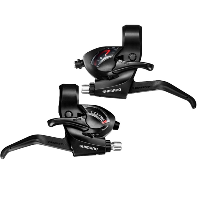 TROCADOR RAPID FIRE SHIMANO EF-41 3X7 COM MAÇANETA EMBUTIDA. O trocador Shimano Rapid Fire (disparo rápido), o que significa que é integrado ao freio para facilitar a troca de marchas e dar mais performance ao sistema de câmbio. É composto por 1 (um) gatilho superior e 1 (um) gatilho inferior desenvolvidos com tecnologia de ponta para oferecer uma troca de marchas macia e precisa. Os manetes de troca/freio combinam ajuste do alcance , troca de marcha EZ FIRE PLUS e OPTICAL GEAR DISPLAY em um conjunto durável.. Especificações: Modelo: ST-EF41-7R/3L. Série: TOURNEY. 3x7= 21 marchas. Material: Revestimento em plástico / Corpo em alumínio e manetes em Nylon. Manetes de freio para dois dedos. Gatilhos e manetes ergonômico. Troca de marchas rápidas e suave. Peso: 410 gramas. Itens Inclusos: Trocadores direito e esquerdo. Cabo de aço das marchas.