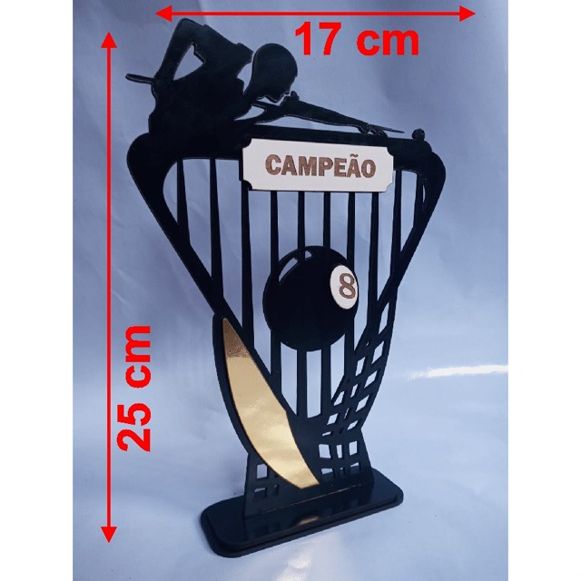 troféu campeão de sinuca medidas :25cm altura x 17cm largura acabamento : mdf revestido com vinil, detalhes em relevo branco e dourado veja o vídeo.