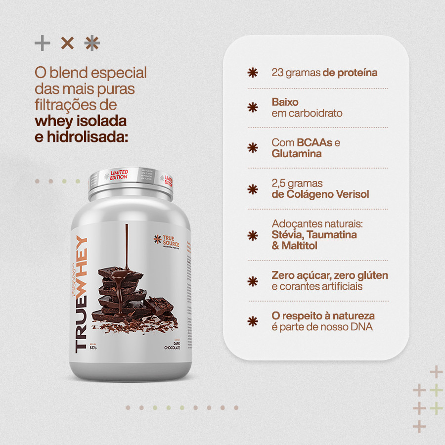 WHEY LEVE, LIMPO, NATURAL E INCRIVELMENTE DELICIOSO! Nosso True Whey tem um blend especial das mais puras filtrações, a hidrolisada e isolada. Lhe oferecemos 23 gramas de proteína e 5,3 gramas de BCAAs na dose, além de 2,5 gramas de Verisol®. Nosso whey é para quem buscar o melhor! O melhor resultado e com melhor produto. O True Whey pode ser utilizado para quem busca o emagrecimento verdadeiro, já que é rico em proteínas e gorduras do bem, que lhe deixará durante mais tempo com aquela sensação de conforto e saciedade. Para os que buscam volume muscular ele é ideal, pois contem proteínas rapidamente utilizadas pelo seu corpo, aumentando ainda mais a síntese proteica e aporte nutricional adequado. Nosso whey ama a natureza, pois ele é extraído de leite de vacas que são criadas soltas e são livres de rações com aditivos químicos, antibióticos ou hormônios. Em nosso whey tem 5,3 gramas de BCAAs, que são os aminoácidos de cadeia ramificada, muito importantes para a manutenção da massa magra, evitando o catabolismo e a fadiga muscular, porque sabemos que ninguém merece ficar com aquela sensação de cansaço excessivo após um treino mais intenso. Além dos BCAAs, a Glutamina também faz parte da composição. 5 gramas desse aminoácido tão importante para a imunidade, pois nutri as células intestinais e fundamental para a recuperação muscular. Para nós, a beleza vem de dentro e pensando nisso que adicionamos na formulação o peptídeo do colágeno hidrolisado Verisol®. Um peptídeo que passa integro pela sua mucosa intestinal e vai direto para os fibroblastos e elastinas, estimulando ainda mais a produção de colágeno nessas células, diminuindo comprovadamente, as linhas de expressão, melhorando aspecto da pele. E sabe o que é ainda melhor? Que se você fizer o uso continuo, irá diminuir também a celulite, estrias e a flacidez. Puro como a natureza deve ser, o True Whey é adoçado com estévia, taumatina e maltitol, adoçantes naturais, além de ser livre de qualquer corante ou aditivo artificial. True Whey sabor Dark Chocolate: chocolate escuro, intenso, com o puro sabor do cacau.