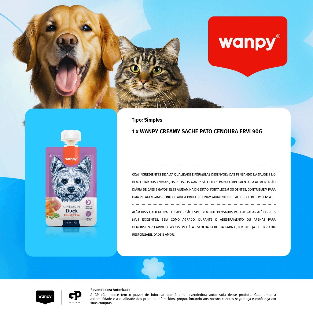PRODUTO ORIGINAL COM NOTA FISCAL! - - - - - APRESENTAÇÃO: 1 x Wanpy Creamy Sache Pato Cenoura Ervi 90G - - - - - - - - - - DESCRIÇÃO: Muito mais do que um petisco, um momento de conexão entre você o seu pet! Os Creamies de Pato, Cenoura e Ervilha promove um momento de conexão único entre tutor e pet. Você pode adicionar o creamy junto com a ração seca, ou oferecer diretamente no sachê. O formato de tubo da embalagem faz dele o aliado perfeito para momentos como dar medicamentos também. Possuem vitaminas em sua composição, e são livres de corantes ou conservantes artificiais. Cremoso, nutritivo, irresistível e muito maior! - - - - - MODO DE USO: Ofereça a recomendação diária descrita na embalagem ou sempre que necessário para agrado do seu pet! Tal petisco não substitui o alimento comleto :) . - - - - - - - - - - Enviamos o seu pedido o quanto antes possível! Agradecemos a preferência.