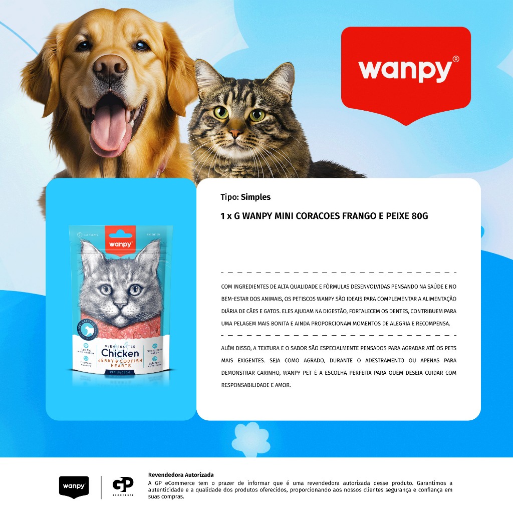 PRODUTO ORIGINAL COM NOTA FISCAL! - - - - - APRESENTAÇÃO: 1 x G Wanpy Mini Coracoes Frango e Peixe 80G - - - - - - - - - - DESCRIÇÃO: Feitos com ingredientes cuidadosamente selecionados, os Mini Corações Wanpy são petiscos pensados para agradar os paladares mais exigentes, sem abrir mão da nutrição. Com frango, que entrega uma explosão de sabor que seu gatinho vai amar. O formato mini foi pensado especialmente para oferecer recompensas rápidas, práticas e com porções controladas. Perfeitos para usar no treinamento, para mimar no dia a dia ou para gatos que preferem petiscos menores e fáceis de mastigar. - - - - - MODO DE USO: Ofereça a recomendação diária descrita na embalagem ou sempre que necessário para agrado do seu pet! Tal petisco não substitui o alimento comleto :) . - - - - - - - - - - Enviamos o seu pedido o quanto antes possível! Agradecemos a preferência.