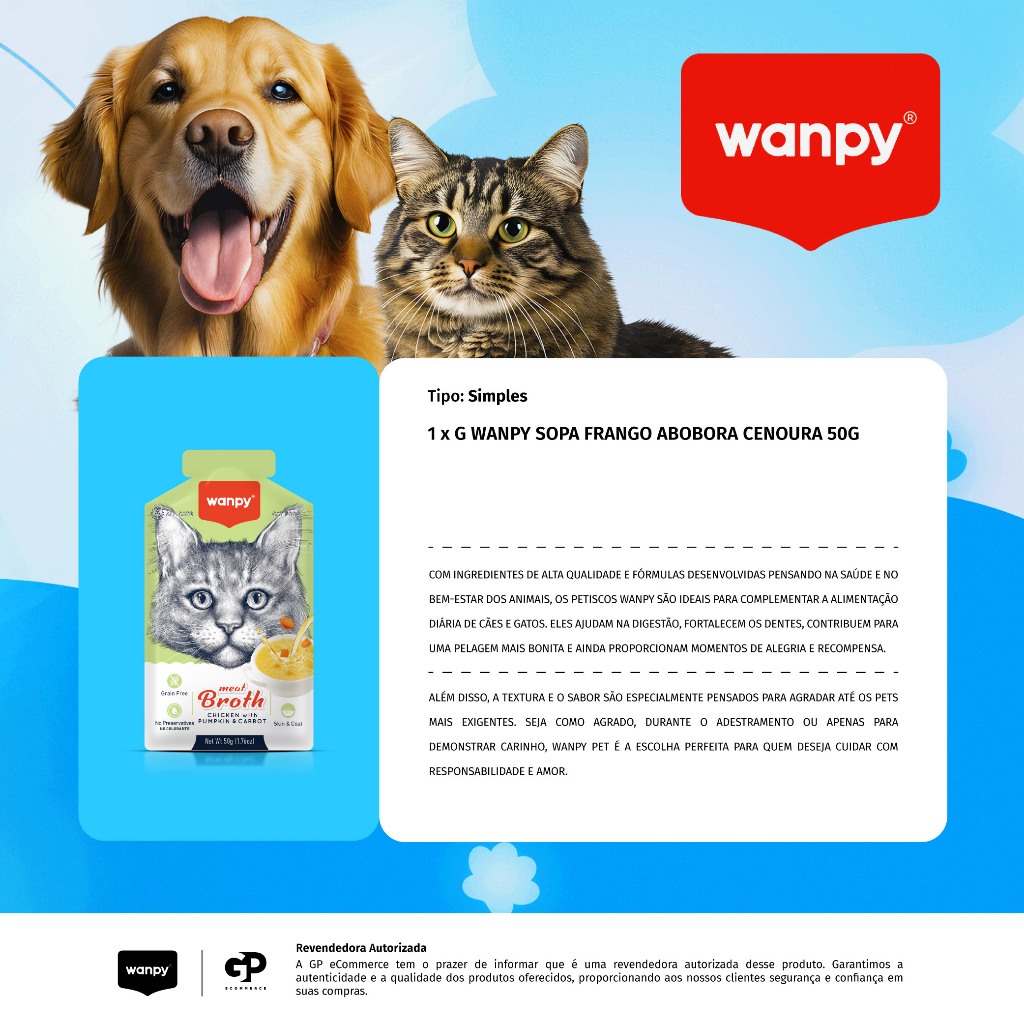 PRODUTO ORIGINAL COM NOTA FISCAL! - - - - - APRESENTAÇÃO: 1 x G Wanpy Sopa Frango Abobora Cenoura 50G - - - - - - - - - - DESCRIÇÃO: Muito mais do que um petisco, um momento de conexão entre você o seu pet! A linha de Sopinha para Gatos da Wanpy oferece uma opção prática, nutritiva e saborosa, auxiliando na ingestão hídrica do felino. Sabor Frango, Abóbora e Cenoura , sem corantes ou conservantes artificiais, são feitos com os caldos de suas proteínas. Pode ser misturado com a ração seca e outros petiscos também, uma alternativa saborosa e funcional! - - - - - MODO DE USO: Ofereça a recomendação diária descrita na embalagem ou sempre que necessário para agrado do seu pet! Tal petisco não substitui o alimento comleto :) . - - - - - - - - - - Enviamos o seu pedido o quanto antes possível! Agradecemos a preferência.