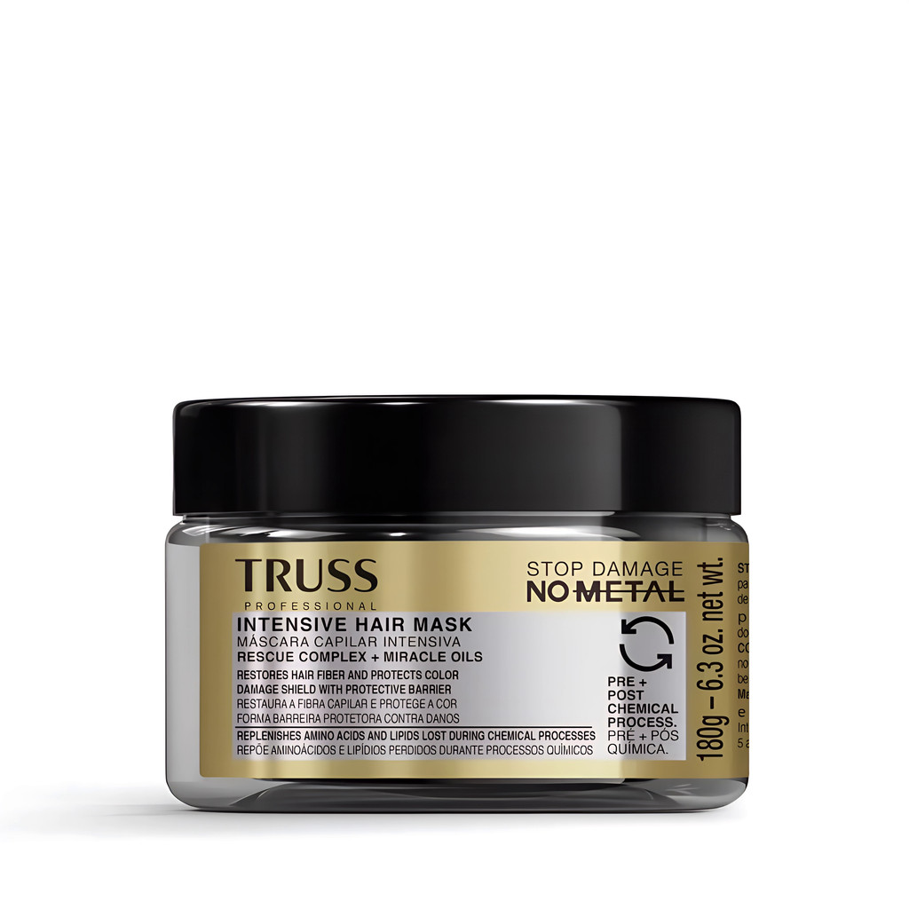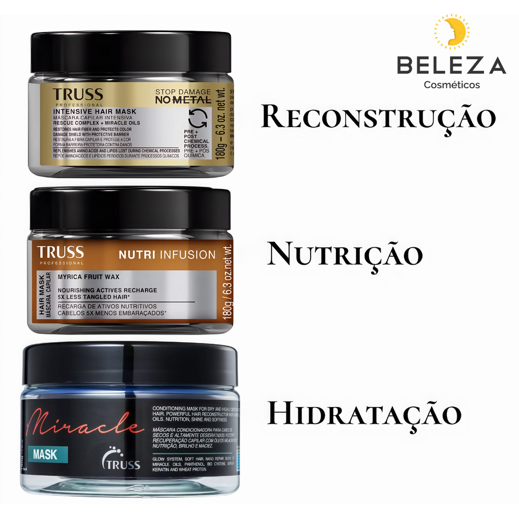 O Kit Truss Cronograma Capilar reúne três máscaras profissionais de 300g cada, desenvolvidas para atender todas as etapas essenciais do tratamento capilar: Hidratação, Nutrição e Reconstrução. Máscara Nutri Infusion 300g: promove nutrição intensa, devolvendo lipídios e óleos essenciais para combater o ressecamento e o frizz. Máscara Miracle 300g: hidrata profundamente, repõe água e umidade natural dos fios, garantindo maciez e brilho imediato. Máscara No Metal 300g: atua na reconstrução capilar, fortalecendo a fibra, reparando danos e protegendo contra metais pesados presentes na água. Benefícios do Kit: ✔ Tratamento completo em três etapas ✔ Recupera fios danificados por química ou calor ✔ Deixa os cabelos mais fortes, macios e com movimento natural ✔ Resultados visíveis já nas primeiras aplicações Modo de uso: Alterne as máscaras conforme a necessidade dos fios (hidratação, nutrição ou reconstrução). Aplique nos cabelos limpos e úmidos. Deixe agir conforme indicado na embalagem e enxágue bem. Resultado: Cabelos saudáveis, nutridos, hidratados e reconstruídos, com brilho intenso e toque sedoso.