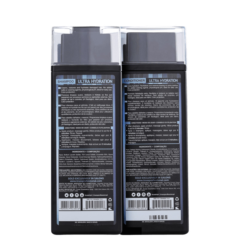 O Kit Truss Ultra Hydration é perfeito para dar aquela dose de hidratação que os cabelos secos e danificados precisam todos os dias. Faz uma reposição de umidade e proteínas, além de selar as cutículas para manter os ativos dentro dos fios. Faz uma limpeza suave, disciplina e resgata a maleabilidade natural do cabelo. O Kit Contém: 01 Truss Ultra Hydration - Shampoo 300ml: restaura a hidratação perdida por mais tempo. 01 Truss Ultra Hydration - Condicionador 300ml: hidrata e aumenta a resistência, o brilho e a maciez dos fios.