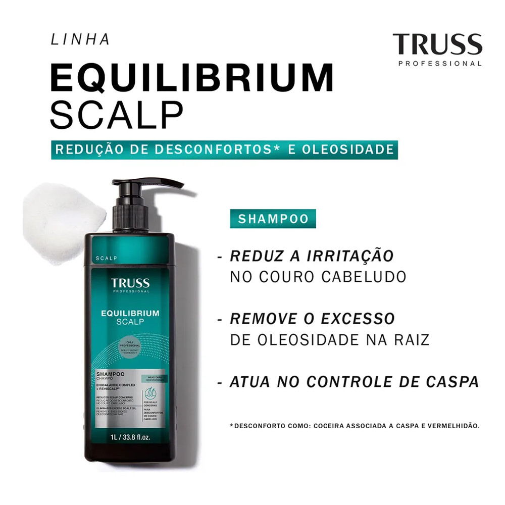 Truss Equilibrium Scalp Uso Diário Shampoo 1L SOBRE A LINHA Equilibrium Scalp é a linha de TRUSS que promove ação antioleosidade, anticaspa e anti irritação* . Com a tecnologia Scalp Reboost, Equilibrium Scalp traz efeito de longa duração com ação calmante e revitalizante do couro, eliminando 100% da caspa visível com fragrância fresca que promove sensação de bem estar. Indicação:Indicado para cabelos mistos, especialmente para quem sofre com raiz oleosa e pontas secas. Ideal para manter o couro cabeludo limpo, equilibrado e saudável no dia a dia.Ação:O Truss Equilibrium Scalp Shampoo oferece limpeza profunda e refrescante, removendo o excesso de oleosidade e impurezas sem agredir os fios. Sua fórmula rica em aminoácidos, pantenol e extratos vegetais hidrata suavemente as pontas, fortalece os fios e regula a oleosidade do couro cabeludo.Conselho de Aplicação:Aplique nos cabelos úmidos, massageando o couro cabeludo até formar espuma. Enxágue e repita se necessário. Para melhores resultados, utilize o condicionador da mesma linha.Resultado:Cabelos leves, soltos, com raiz equilibrada e pontas hidratadas, além de brilho natural e sensação de frescor duradoura.Contém:01 unidade Truss Equilibrium Scalp Uso Diário Shampoo 1L
