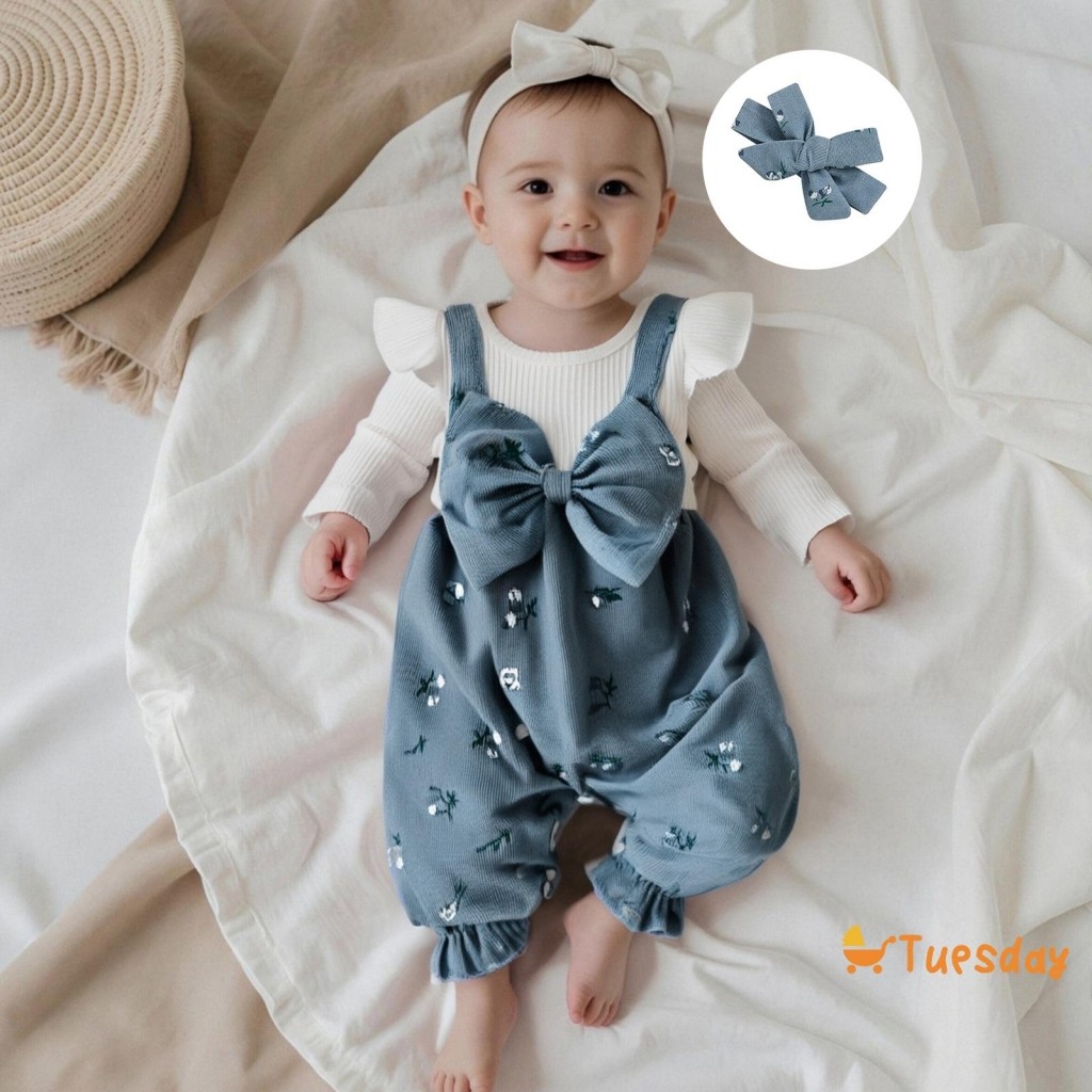 TSD-Macacão De Manga Comprida Para Bebês Meninas Com Estampa Floral Falsa De Duas Peças Laço E Faixa De Cabeça Fofa