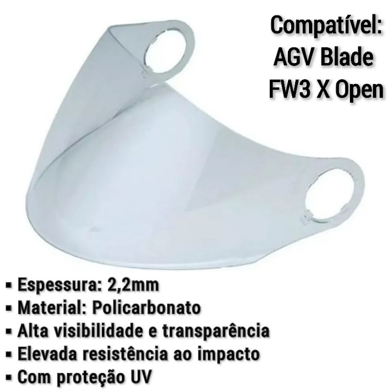 Compativel com os capacetes : AGV - Blade FW3 - X Open Lente de policarbonato de excelente qualidade e super resistente. Com tratamento anti risco (Durabilidade: Até 10x mais) Injetada 2,2 mm de espessura Com proteção UV Padrão Original Peça extremamente precisa que oferece total segurança durante o uso. Os produtos possuem encaixes perfeitos e não necessitam de adaptações para serem instalados.