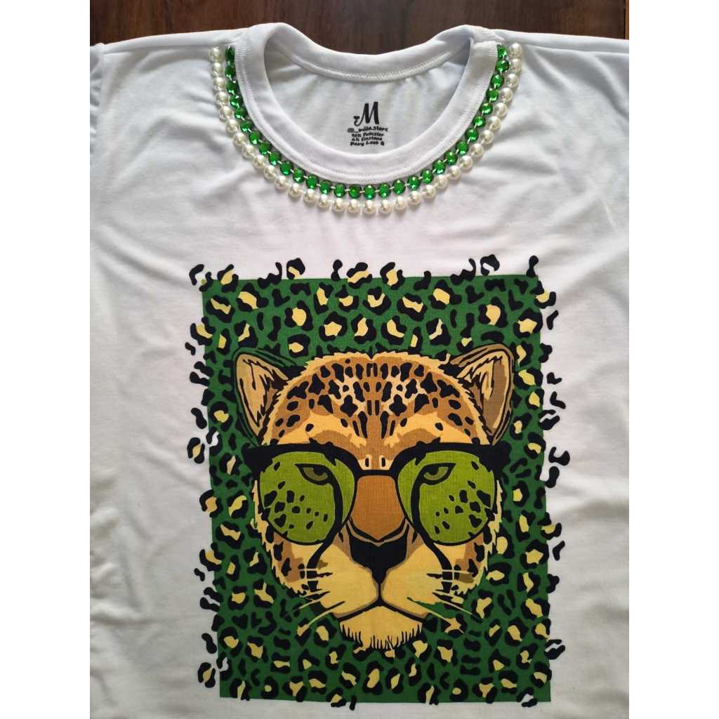 Tshirt feminina estilosa luxo com pedrarias na gola onça verde blusinha